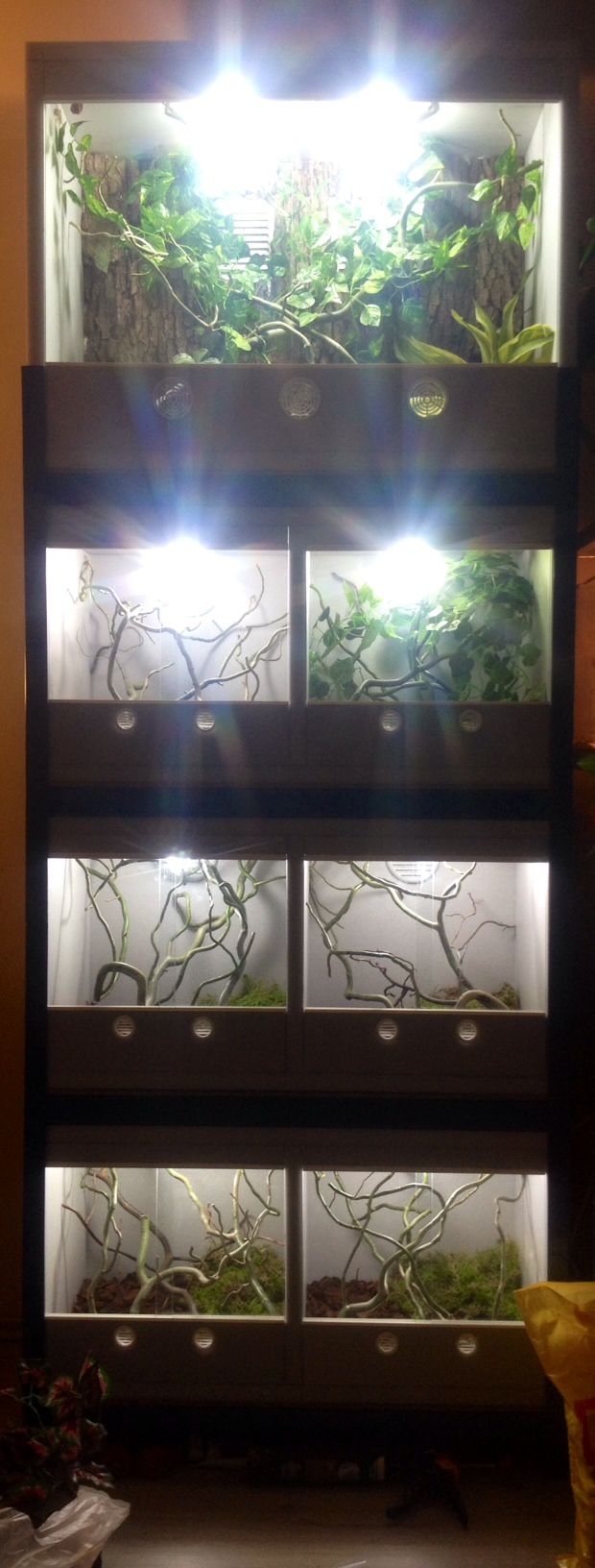 na výbojku to bohužel není, to bych je tam upekl, i když to má otevřený strop..takže celková watáž na jedno terárium je cca 60W..