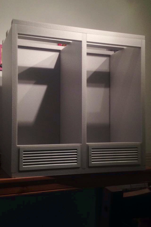 Pro chamíky mám postavené toto dvojterárium cca 50x50x90, zatím teda nemám vybavené, ale osvětlovat ho bude úsporná (kompaktní) zářivka (cca 14W a 6500K) a vytápět 15-20W bodovka v patici GU10, o UVB se postará nějaký REPTIZLO