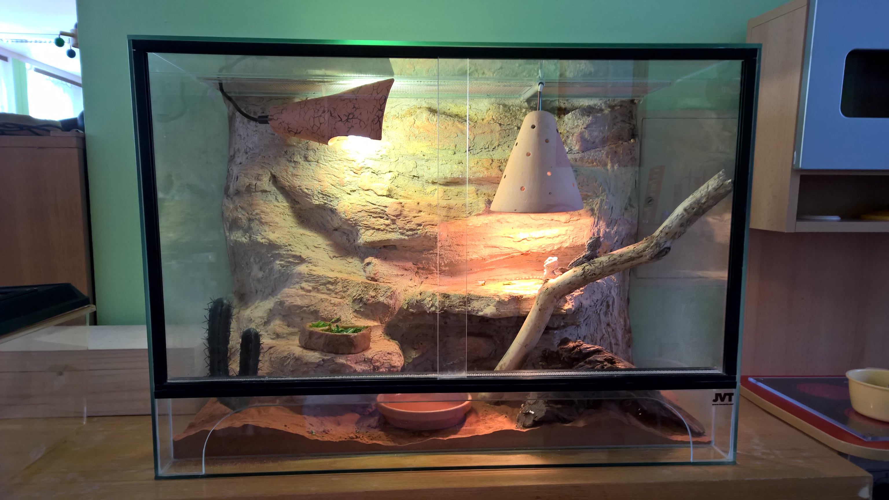 Dobrý den, prosím o pomoc s teráriem pro agamy. Dostala jsem ho již zařízené, ovšem nevhodně, jen s 1 bodovým světlem na teplo. Přidala jsem zdroj Uvb a plánuji ještě obyčejnou zářivku nad terárium pro více světla. Rozměry terária jsou 70x40x50. Teploty jsou myslím dobré, 40 pod lampou a jinak 24 stupňů. Nevím, jak vysoko mají být lampy. Na uvb je 38cm nad kamenem a na teplo jen 12cm nad kamenem. Také nevím,jak silné žárovky volit. Jsem začátečník a nechci udělat chybu. Agamky mám týden, jsou jim 3 měsíce a zatím jsou v pohodě. Také se mi stává,že lezou na kryt lampy s UVB, nemohou si ublížit? Děkuji za odpověď. Přikládám foto.