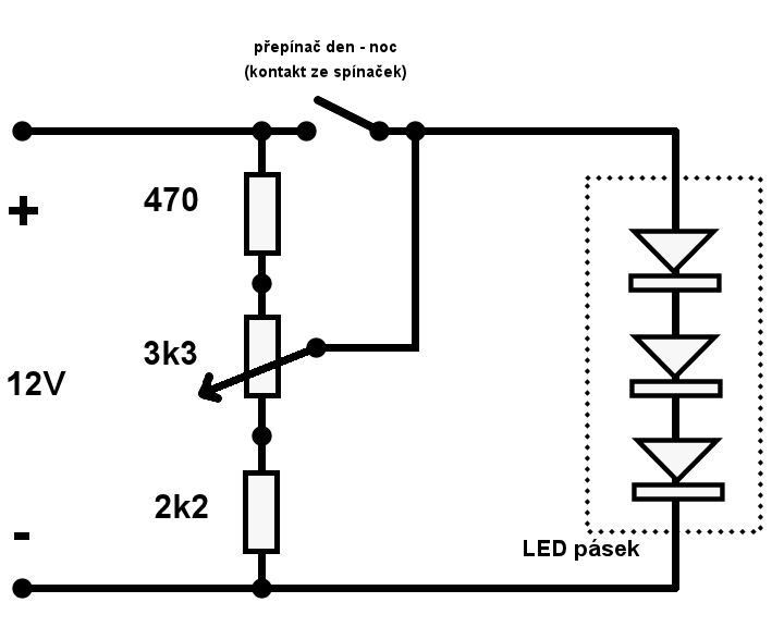 - žádné nepřirozené barvy pro noční osvětlení bych nevymýšlel, stačí stmívat ten jeden bílý pásek co tam bude. Přes den poběží 12 V "na přímo", přes noc tam přepnout nějaký odpor který omezí proud přes LED - nejlíp si tam dát potenciometr kterým si nastavíte co bude vyhovovat. Příklad, hodnoty jsou jen tak "od oka":