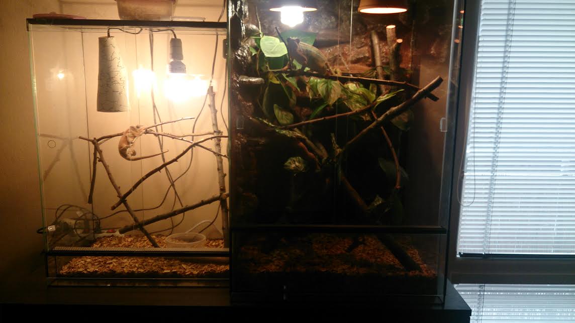 Ahoj.Mam krasneho 2ročného samčeka Pardálisa ambilobe red(vid foto)a k nemu samičku...Obe mám v osobitných terariach,žeru,sú čulé k svetu,všetko čo potrebujú k bezstarostnému životu maju k dispozícii...Ale ked samička dojde k obdobiu,ked sa može pripúštat samček,tak samček nemá vobec záujem...Ona je pripravená,nebojí sa ho,ale on akoby nemal záujem.Naozaj si neviem s týmto poradiť.Rád by som mal neaké potomstvo,ale moj chamík je neaký impotento.Viete mi poradit,kde može byt problém?Resp. ešte dotaz.Je lepsie davat samicku k samcovi,alebo vyberat samca a davat ho zo svojho pelechu k samicke...na fotke to druhe tera zo samickou je provizorne.Už sa mi vyrába take isté ako má samec...dakujem za rady :)