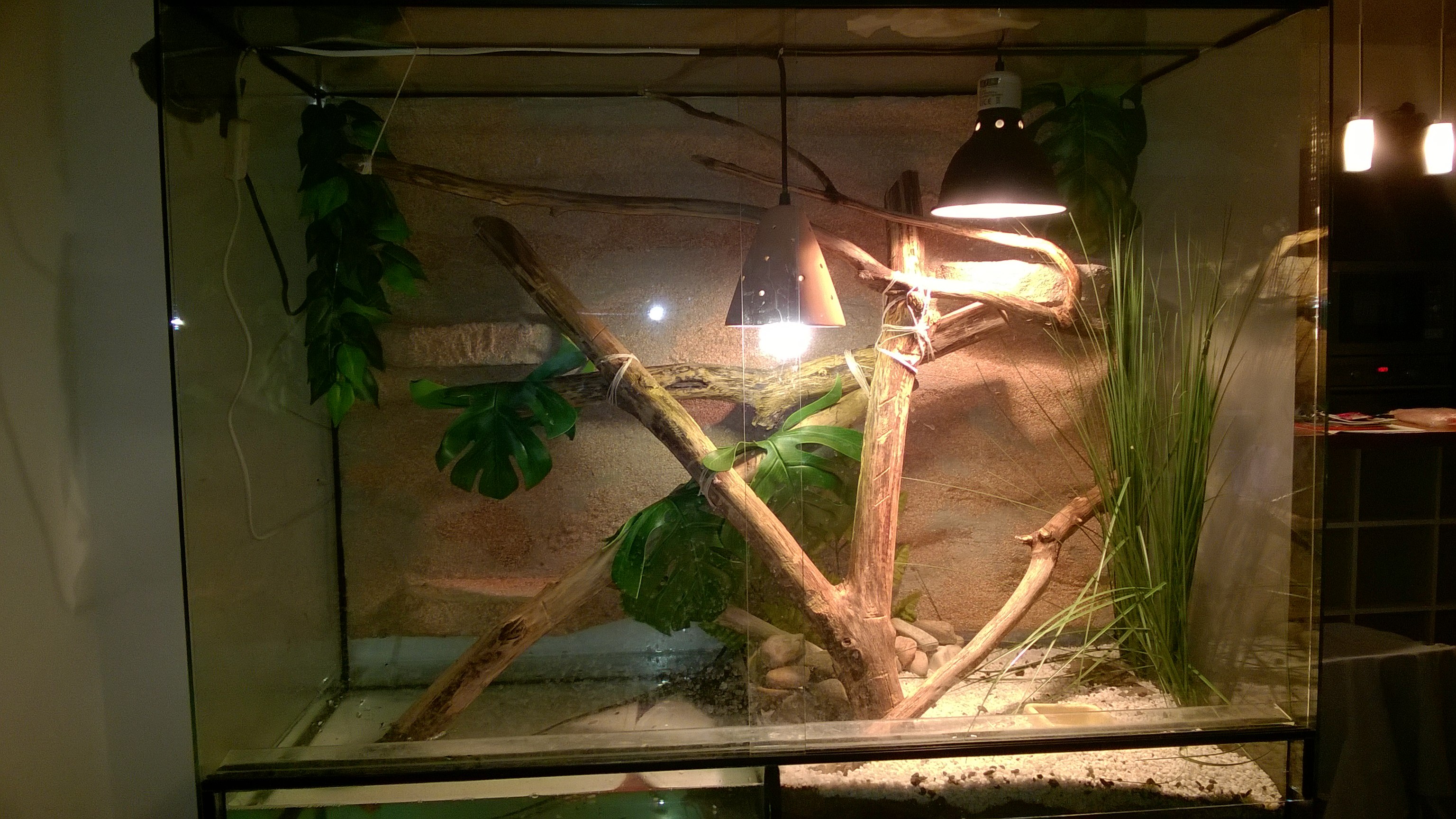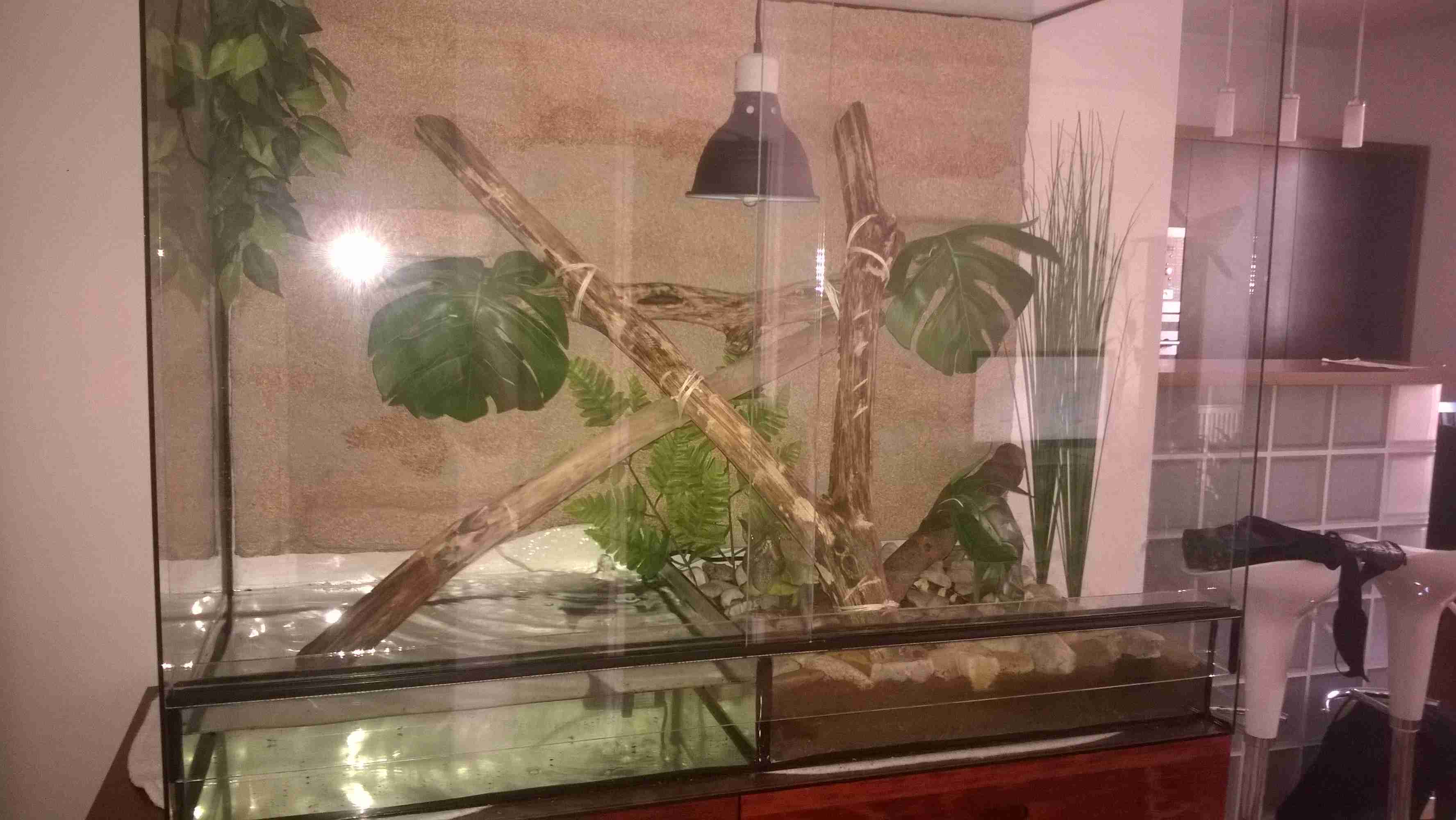 Jen takový postřeh jak píší i ostatní má to jako výkladní skřín ono celoskleněné je praktické ale též přináší mnoho záludností= jedna z nich je odraz vnitřních světel--má tam jen tyto nebo také zářivku? pokud ne doporučuji klidně položit nahoru atˇ má nasvíceno pokud možno co nejvíce prostoru--dále doplnit na boční stěny třeba korkové tubusy atˇ může šplhat a v případě pro něho " nebezpečí poklidně odkráčet".