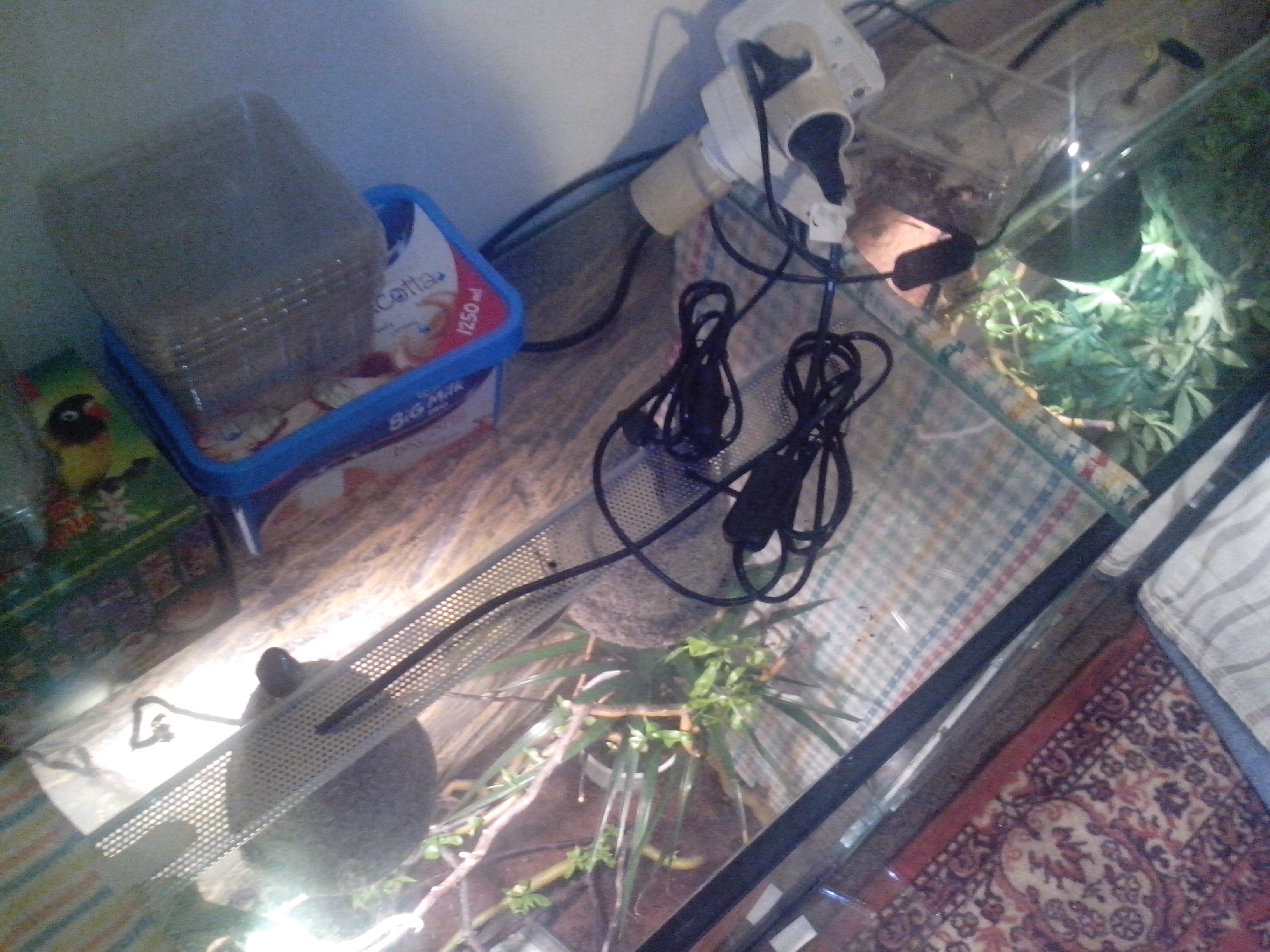 velikost terária: 60 x 40 x 80 cm . Teplota pod lampou 32 stupňů v polovině má 28 a dole 25 stupňů.