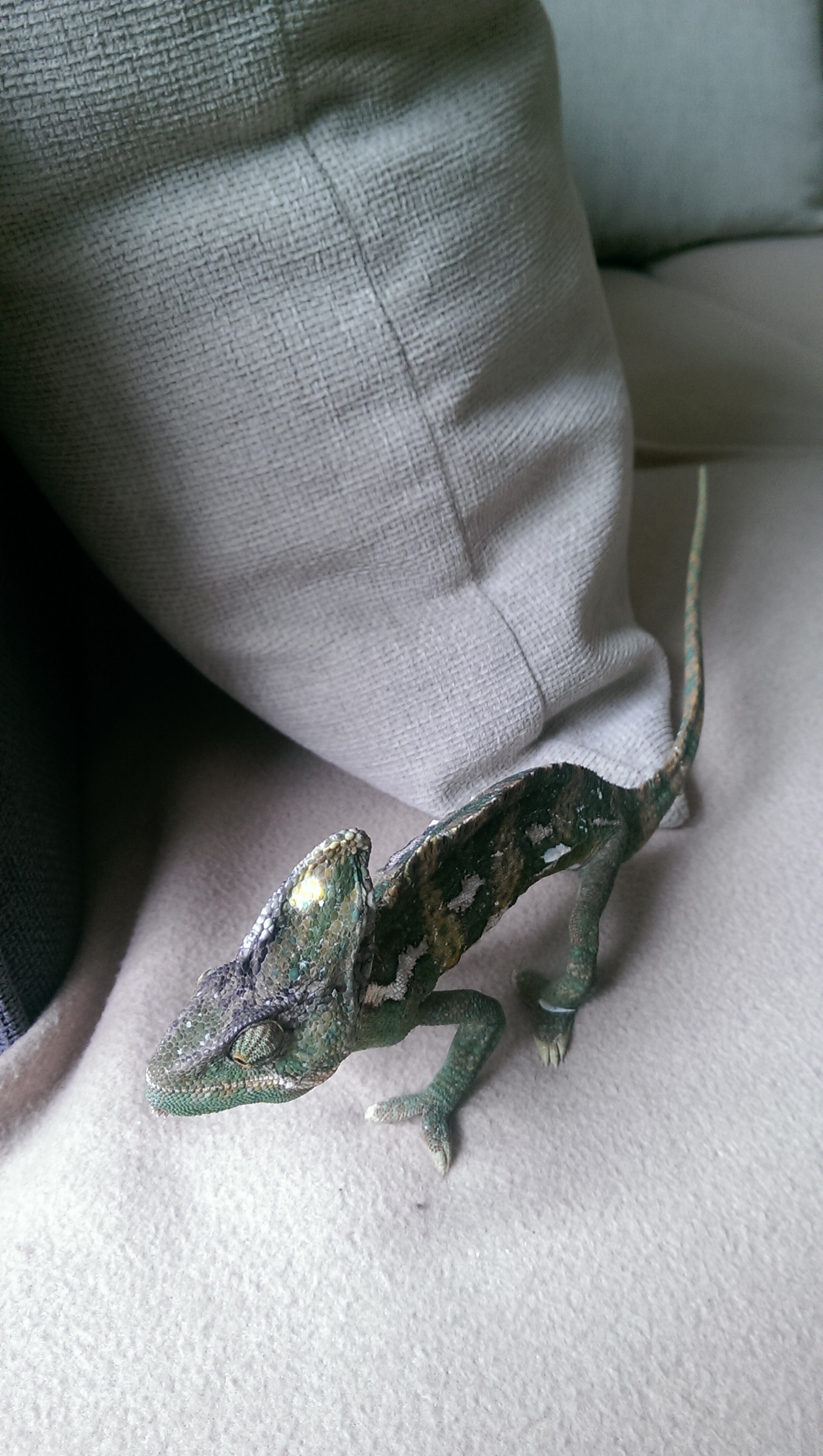 Ten chamík je vychrtlej a totálně zbídačelej (předpokládám, že ho takhle ztýral předchozí majitel) Podávat pouze vitaminovou směs nestačí. Vitaminama se hmyz posypává 1x-2x týdně, zbytek by se měl obalovat v čistém vápníku, kterého mají zrovna chameleoni velkou potřebu a který tady úplně chybí.