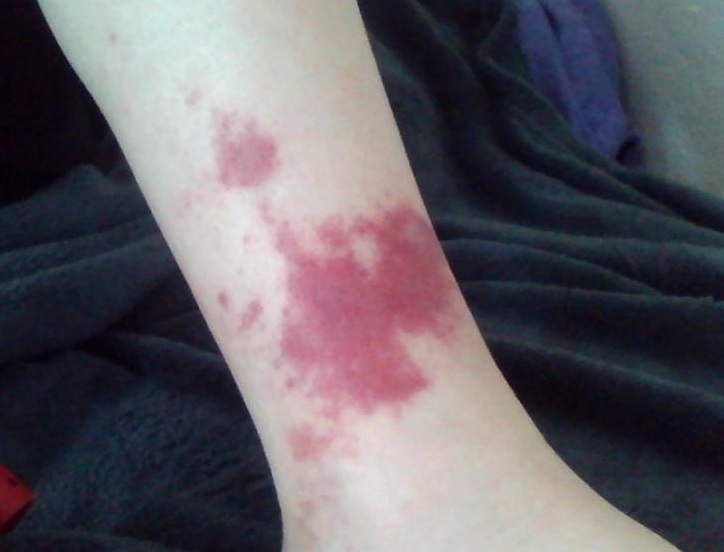 před třemi až čtyřmi dny mě cosi pokousalo ve stanu. Bohužel jsem "pachatele" nepřistihla a míst kousanců/šťípanců jsem si všimla až večer, kdy poraněná místa nesvědila, jen bolela, otekl mi kotník a postižená místa byla sytě červená (podobně jako na fotce). Měla jsem závratě a malinko zvýšenou teplotu (které ale mohlo způsobit i přepracování). Dnes ráno začala postižená místa lehce fialovět a snad i lehce blednout. Proti alergii beru xyzal, takže ta by být neměla.