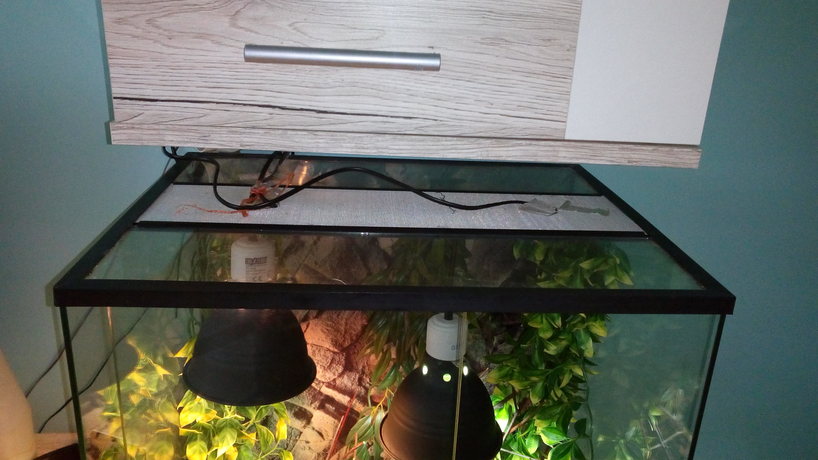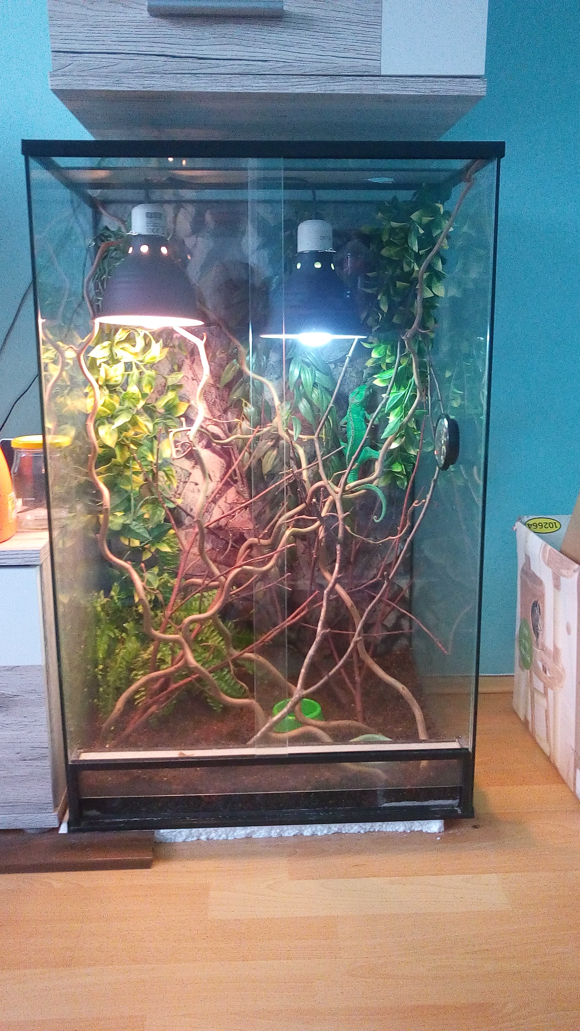 Nojo a jsme doma...vodopád, větrání nic moc, osvětlení by mohlo být řešené taky mnohem líp... A mimochodem, sice to nesouvisí s očima, ale to terárko, respektive pro chameleona využitelný prostor, je strašně malý... Přitom by si bývalo stačilo něco pročíst na netu...jenom tady na poradně se tohle řeší každou chvíli. To pak můžete jezdit za veterinářem a kapat chamíkovi do oka, jak chcete, ale nic se nezlepší, když nemá vhodné podmínky.