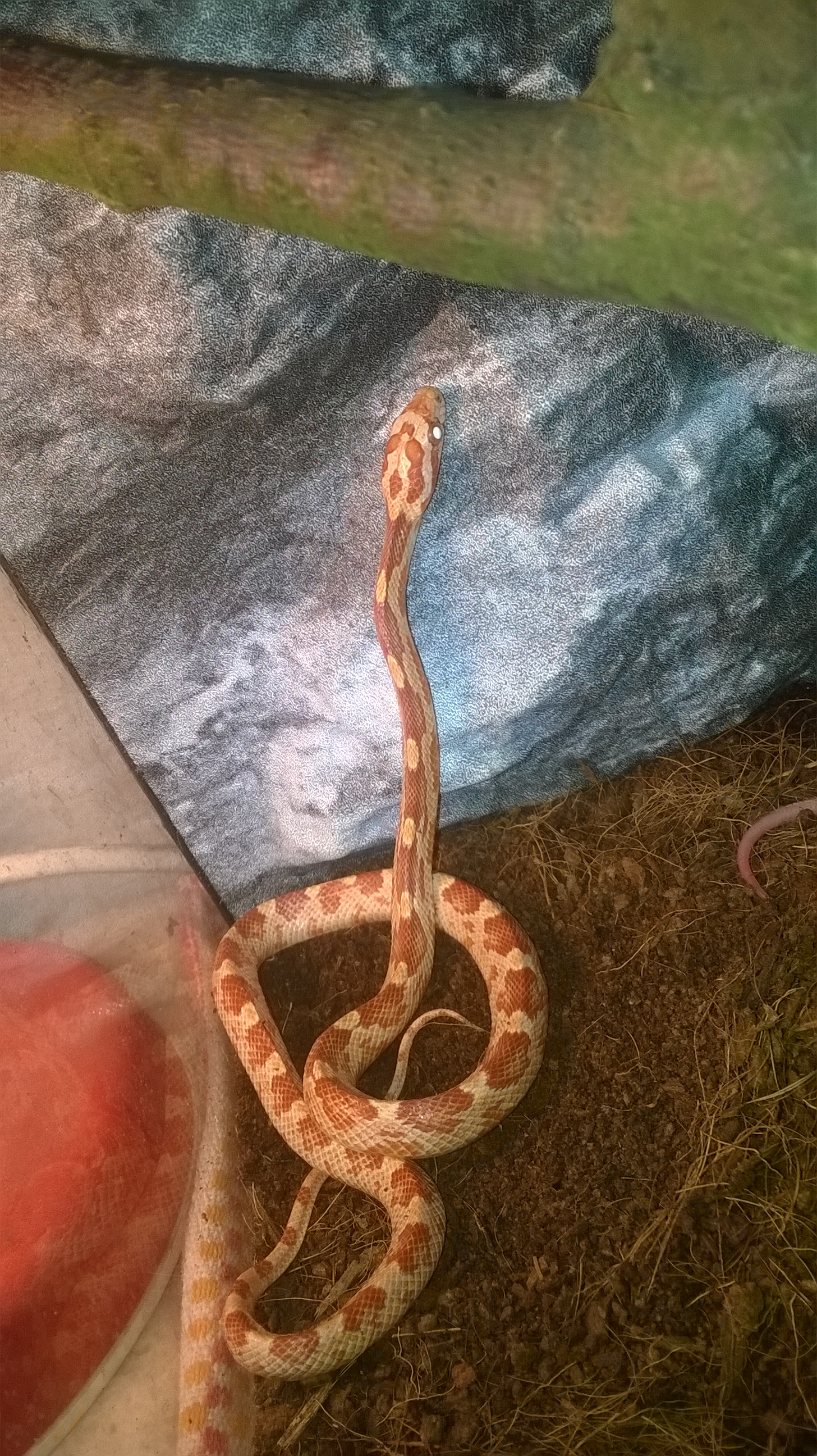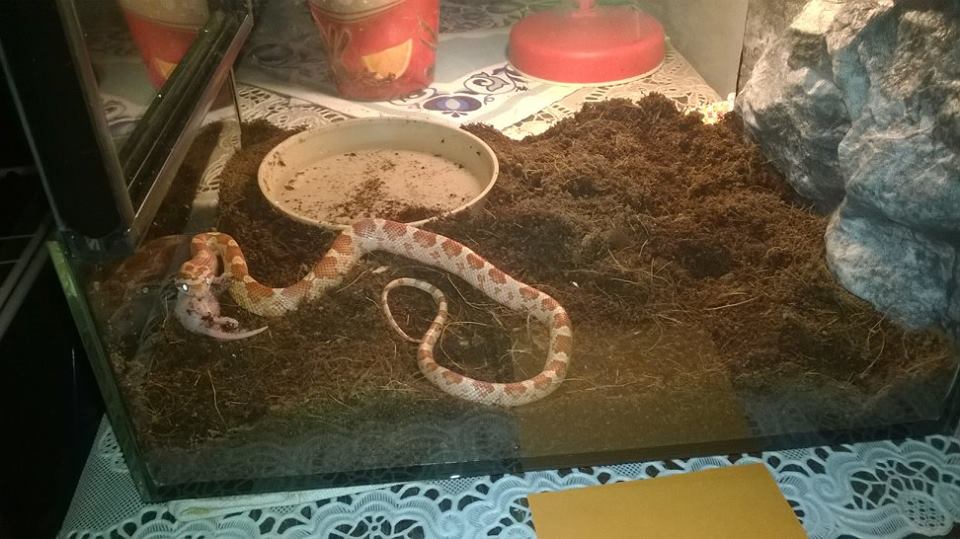 Nevíme čím to je. Možná ale tím, že jsme si pořídili ještě jednoho, trochu většího hada ( terárka mají vedle sebe a pořád na sebe koukají). Myslíte že je to tím? Že se třeba cítí ohrožena?