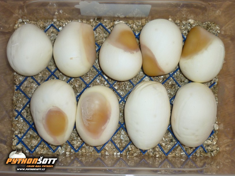 dnes mi snesla samice Python regius snůšku, která obsahovala 13 vajec. Z nich byly 4 neoplozené, 2 byly v pořádku a zbytek vypadá trochu " podivně "