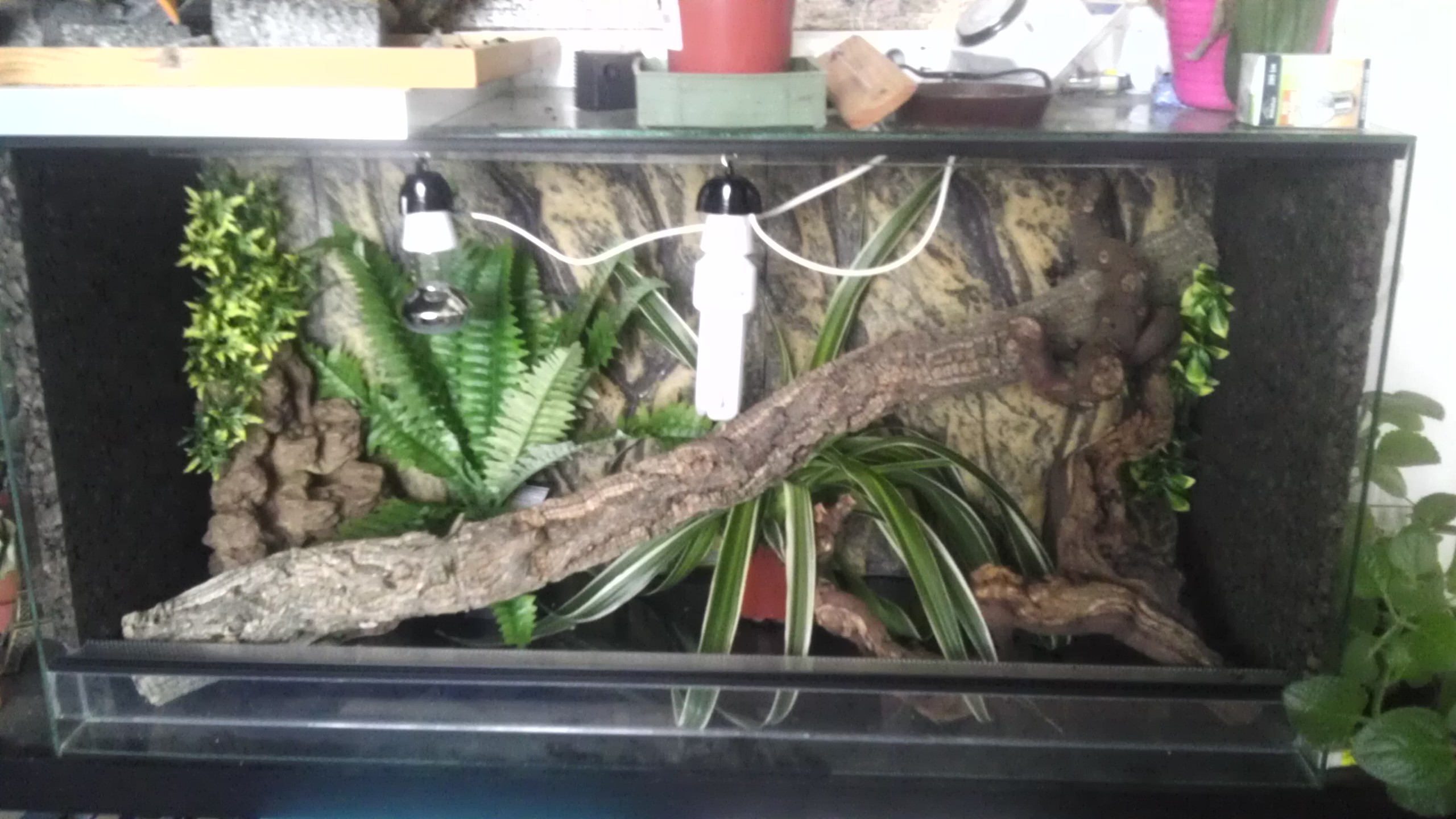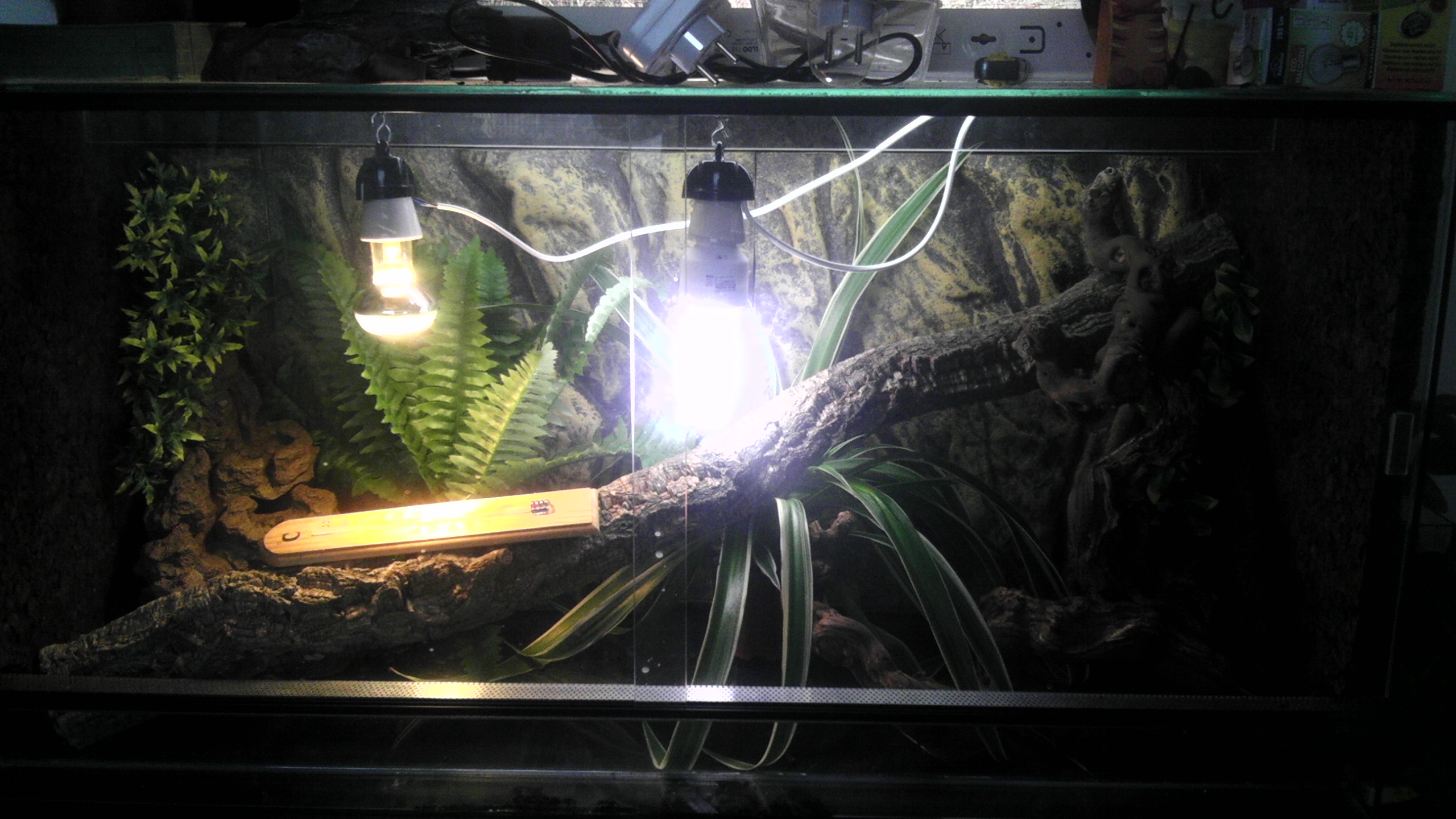 Mám to udělané ze bodovka je na levé straně a uvb uprostřed aby to bralo celé terarium... Takze tepl…