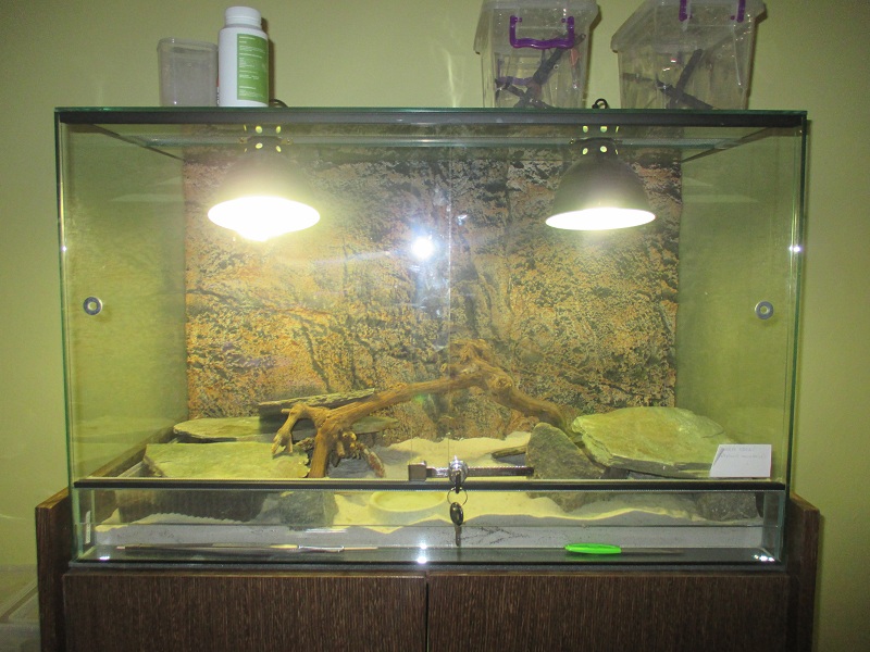 Tera - exoterrácká 80x40x30, dno písek. Úkryty na jedné straně 2 se stále vlhkým lignocelem, na druhé straně "teplé". Teplo pomocí 25W topného kabelu mezi dlažidcemi(obdoba top. kamene), svícení jen "dekorativní" 2 staršími UVB kompakty. Teplotní rozmezí od 38 - 40 na dlaždici až po pokojovku ve vlhkých úkrytech.