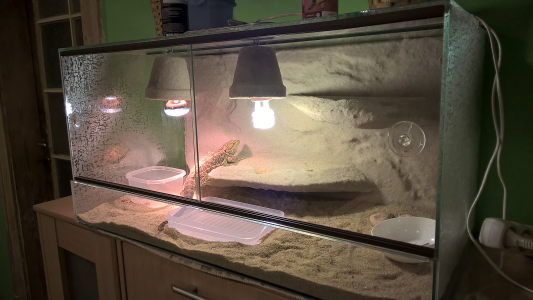 na 4 měsíce to vypada na pořádnýho macka... asi mu bude víc, málo světla v terárku..dosvětlit lineárkou... UVB blíže k te bodovce, na fotce není vidět žádné větrání. co je za UVB?