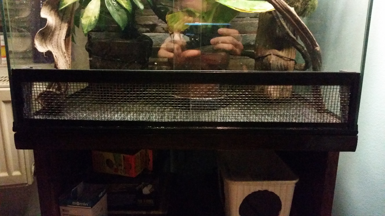 Prřikládám fotografie terária,větrání, chameleona na ruce a kdyz lezi dole v terariu.