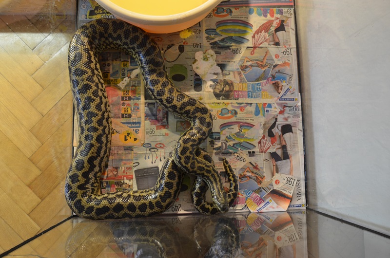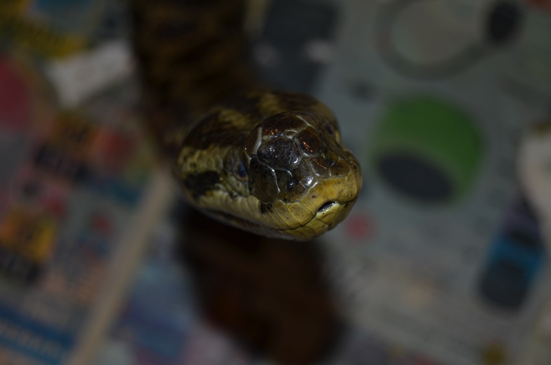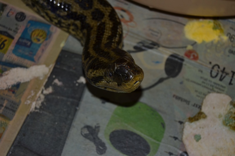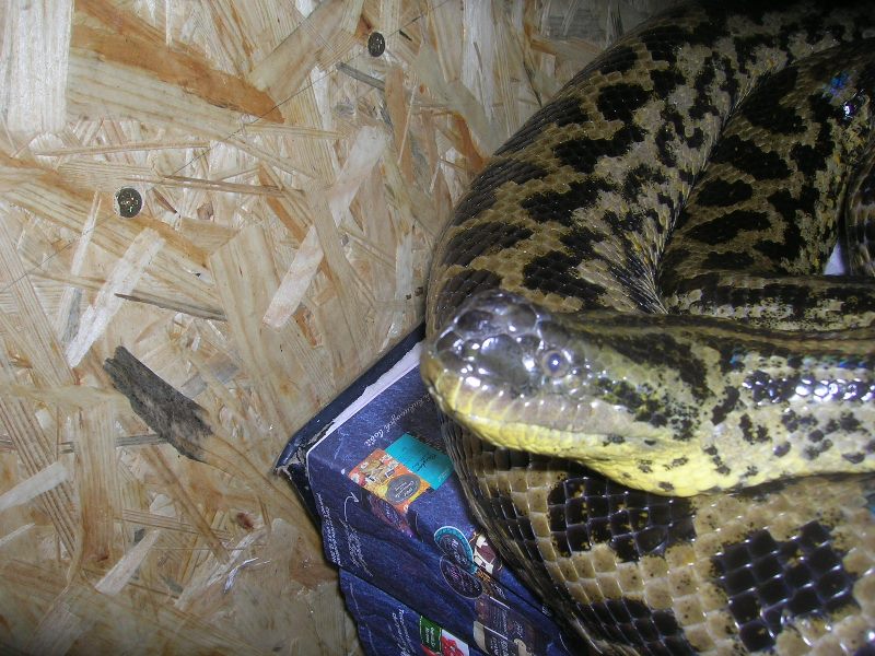 od loňského května mám ve víceméně trvalém "depozitu" anakondu žlutou od jednoho známého, který se o hada nemohl v důsledku stěhování nadále starat. Abych se dostal ke svému problému musím zde uvést některé informace, které jsou dle mého názoru dosti zásadní. Jedná se o 11 let starého samce o délce cca 220 cm. Musím přiznat, že když jsem jej dostal (původně pouze na pár měsíců), tak byl v dosti neutěšeném stavu. Prvně, dle mého názoru byl výživově "podražen", měl kožní problémy po stranách těla a bouli (jak se později ukázalo, nezhoubný nádor - snad fibrom) na čumáku. Hada jsem dostal společně se skleněným akvateráriem o rozměrech 150 x 70 x 80 cm. Původně měl majitel ve dvou třetinách plochy vodu, jednu větev a na vytápění topný kabel. Patrně v důsledku špatné čistitelnosti vodní části terária vznikly zmíněné kožní problémy, které jsem během prvních pár týdnů vyléčil. Terárium jsem upravil tak, že jsem doplnil žárovku a vodu mám pouze v lavóru, do něhož se had může celý stočit, aby byl dobře čistitelný. Po několika pokusech se substrátem jsem skončil u novin a také jsem odstranil větev s topným kabelem, neboť plesnivěla.