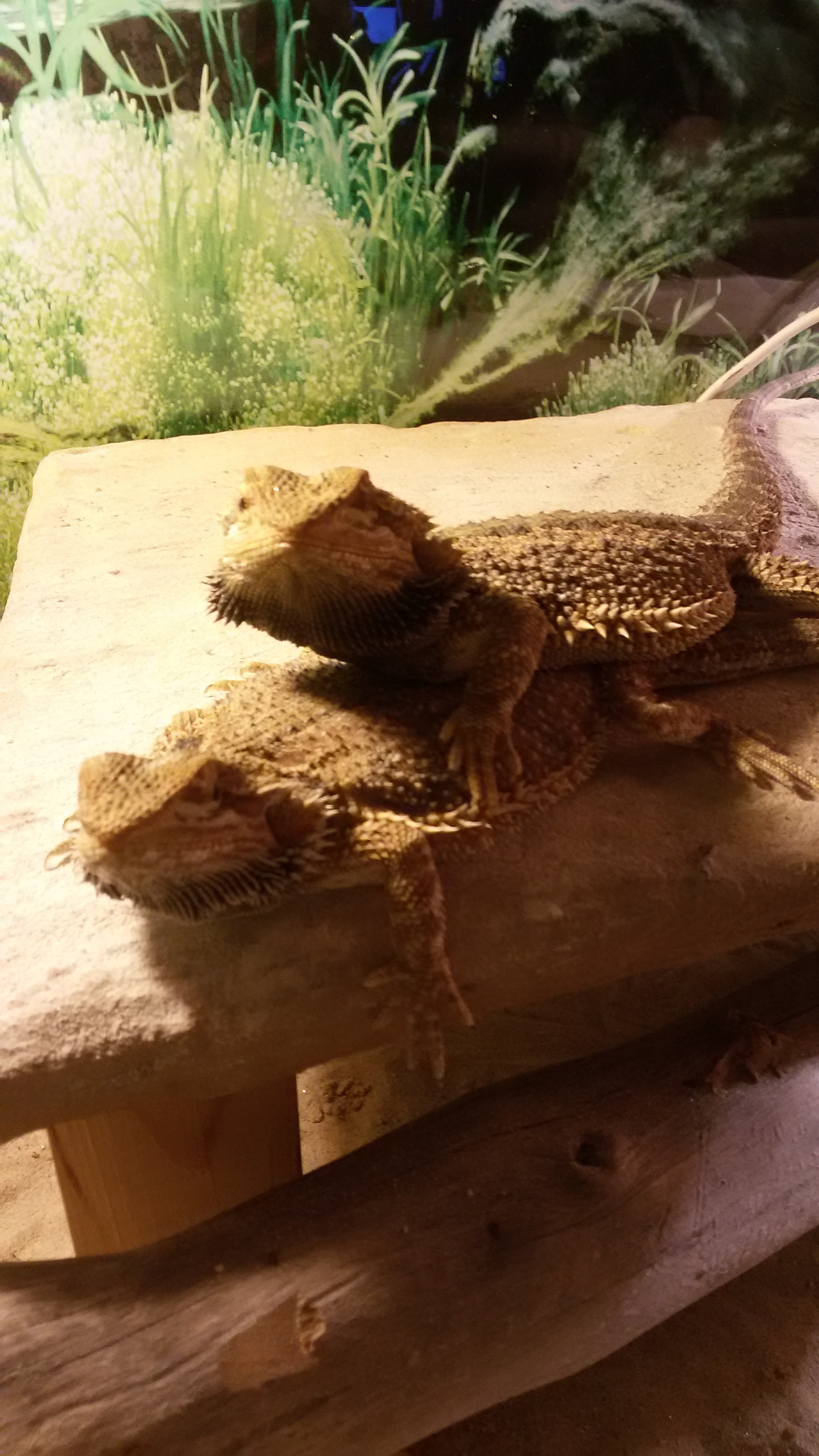 Agama vousatá - nežere, je apatická, druhá zčerná a kýve hlavou a koušek menší