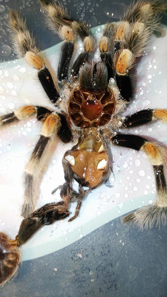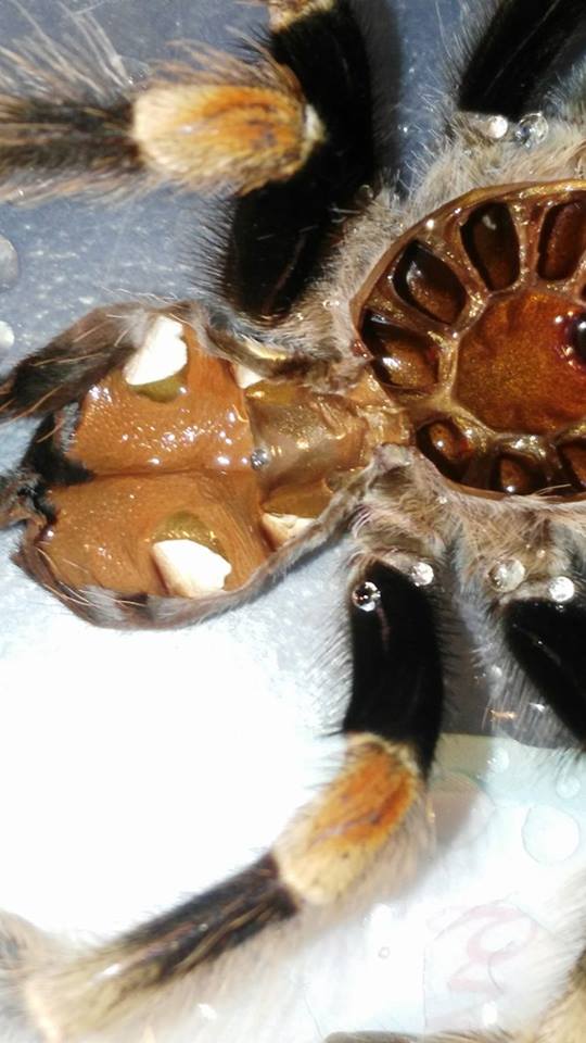 potřebuju pomoct s určením pohlaví. Podle mě se jedná o samce - nevidím spermatéku. Ta dírka uprostřed mi jako spermatéka nepřipadá. Ještě se nejedná o dospělého jedince, ale i tak si myslím, že není šance na samici.
