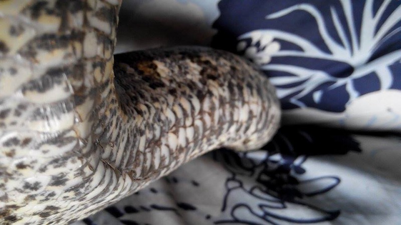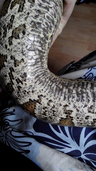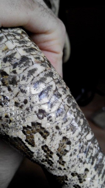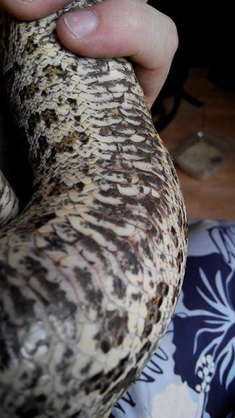 už delší dobu (cca půl roku) mi hroznýš (samice) odmítá potravu, před měsícem po vyzkoušení všeho možného (myš, potkan, pískomil; mrtvý/živí; den/noc; v teráriu/boxu; sama/v páru) jsem přistoupil k násilnému krmení, ale had stále nežere. Je aktivní a neustále leze po teráriu (terárium 170x80cm pro pár). Druhý hroznýš (samec), který je se samicí v teráriu příjímá potravu pravidelně a s "oblibou". Dnes jsem si všiml, že má samice odřené břicho (viz foto), ale žádných ektoparazitů jsem si nepovšiml.