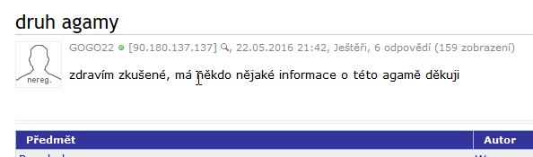 | Tak by snad bylo dobře napsat jaký druh agamy máte na mysli, ne? Haboš 23.05.2016 06:04 |