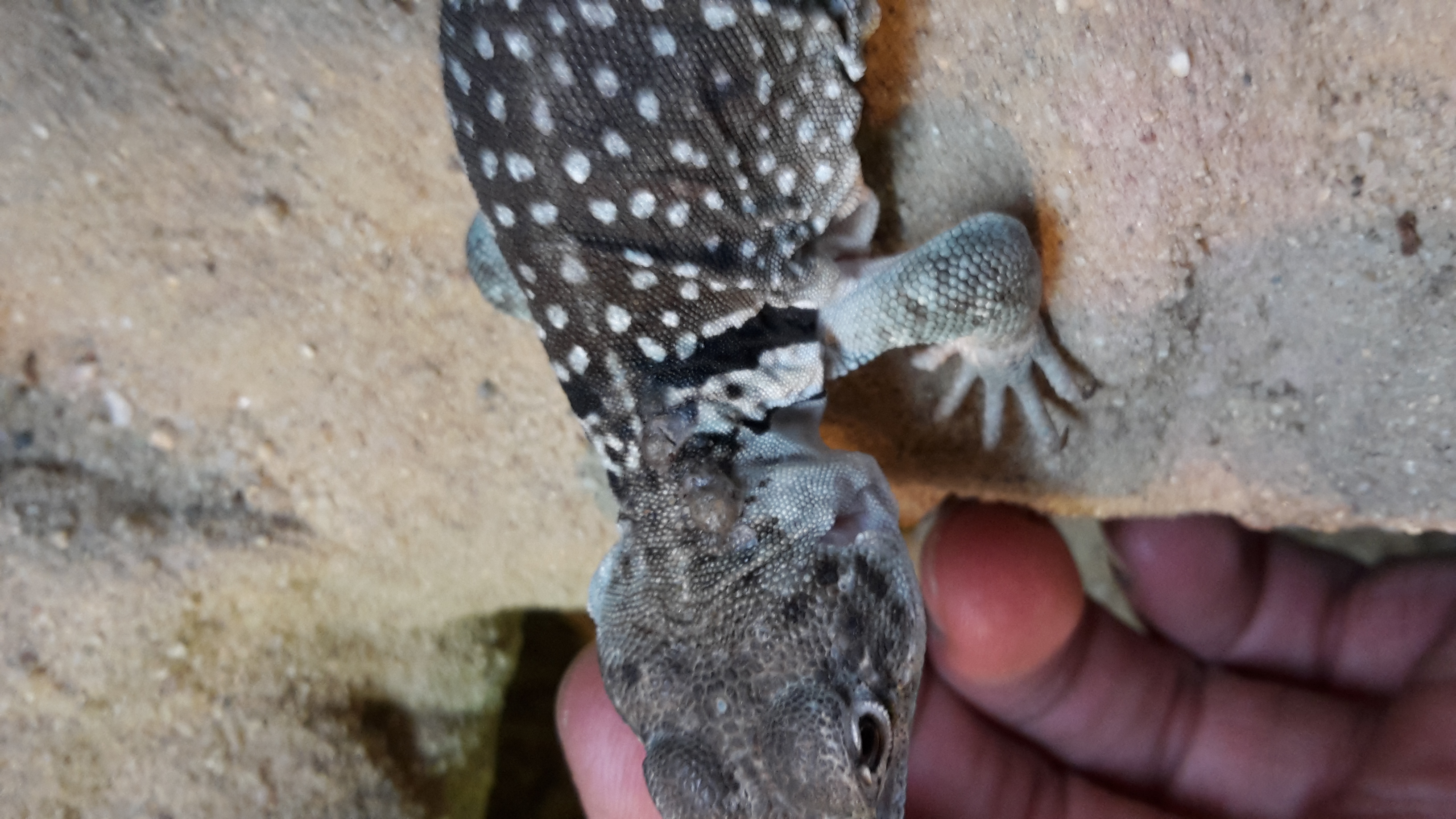 Zdravím,mám skupinku tří leguánků,ale problém má pouze jedna samice.Stáří jedinců je cca 3/4roku.Také je menší vzrůstem oproti ostatním,ale žere normálně.