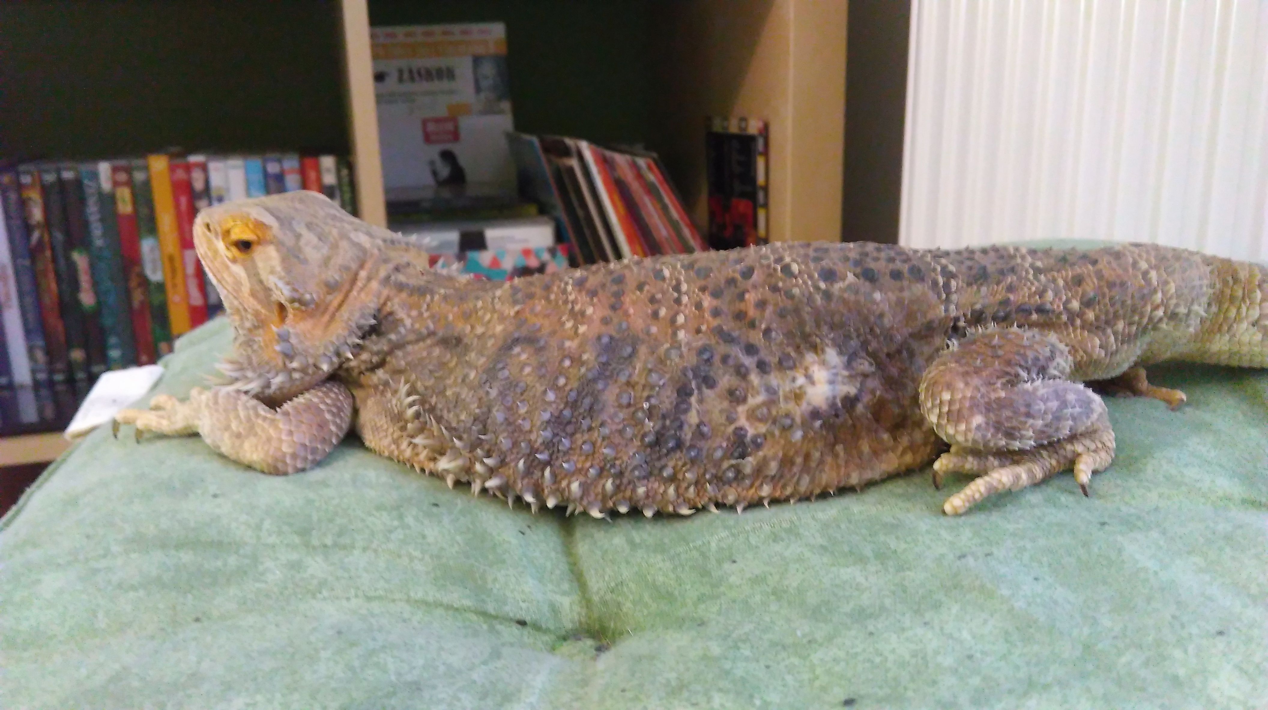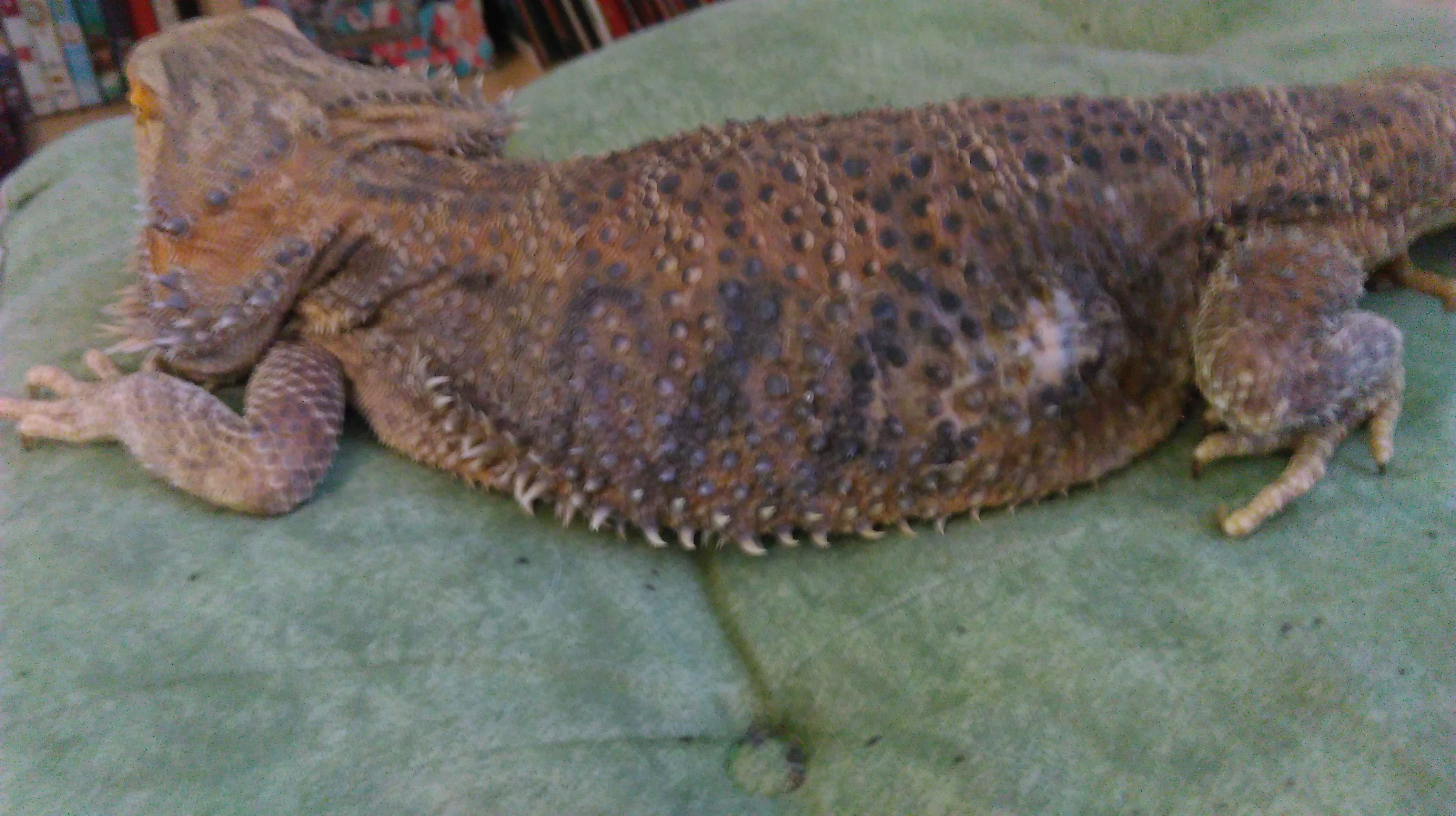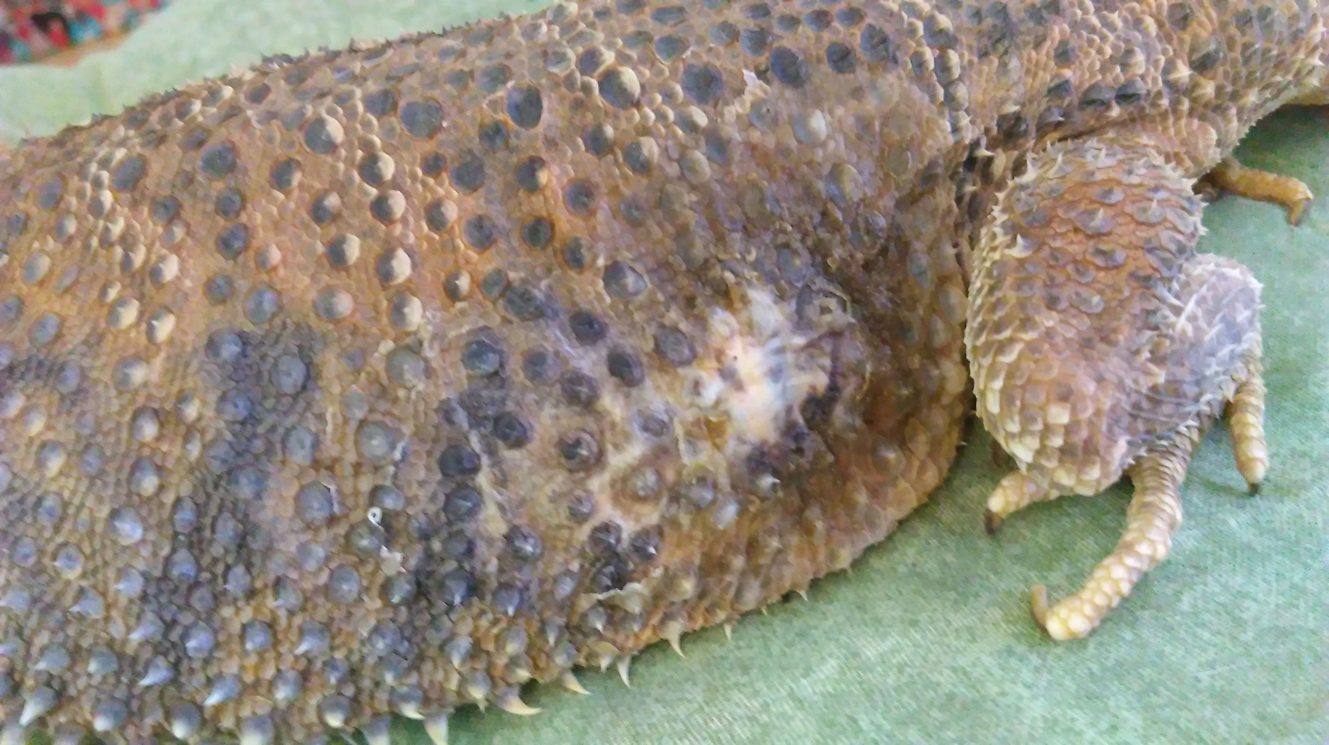 Nasej agame zliezla stara koza a pod nou sa jej objavil bielo zlty flek (na foto). Podla doktora je to jazva a ma to z pliesne. Ja som si myslel ze to ma popalene od svetla. Svietim jej SunLux uv par30 vzdialenost od zvierata 20cm. Na dotyk tam nieje neprijemne teplo, svietim 12 hod. denne. Moze ziarovka tesne pred koncom "zivotnosti" vyzarovat dake skodlive svetlo ? Tam kde ma ten flek ma ziarovka ohnisko.