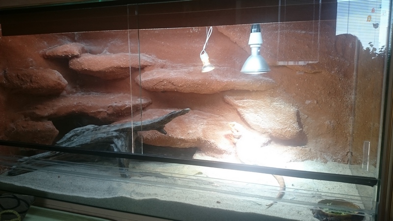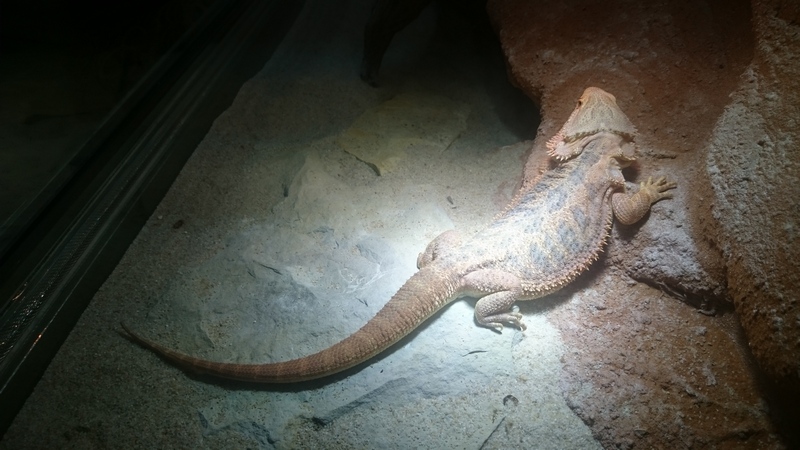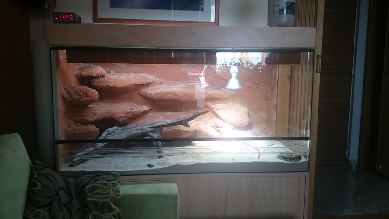 Je to písek do bazénové filtrace. Pampelišky tam má, jen už došly květy :D. Zophobasem jsem mu ráno mával před tlamou a nic. v terárku jsou tak 3-4 šváby dubia. Sarančata se na něm akorát vozí! Totálně je ignoruje! Prosvětlení levé části ....no zkusím pořešit. Buď přidám ještě jednu zářivku 90cm, nebo jen něco lokálně?
