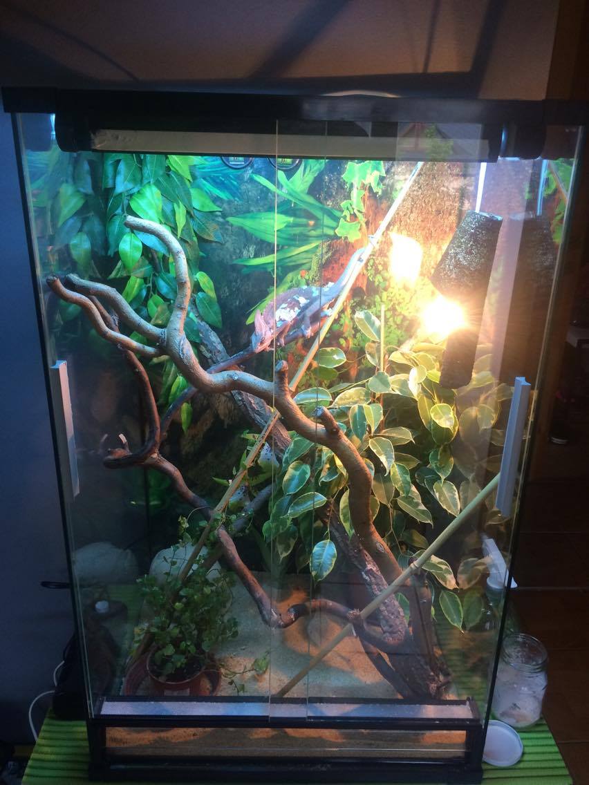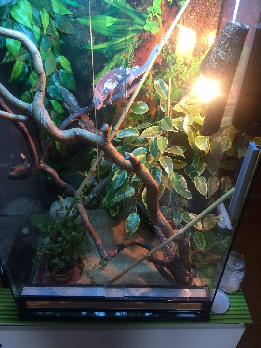 Terárium má rozměry 60x40x80cm, mám jednu UVB zářivku a jednu klasickou výhřevnou žárovku 60. Dvě živé kytky a dvě umělé. Rosím 1-2x denně. Dávám mu zatím pouze cvrčky, pokaždé obalené ve vápníku, v pátek ve vitamínech, v sobotu samotný a v neděli mu nedávám vůbec. V teráriu má nahoře okolo 32 stupňů. Větrání nahoře a dole, viz foto.