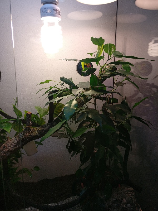 Zdravím, tak chameleón už je doma, ale potrebujem pár rád ohľadom tera :-D. Zatiaľ má niečo cez 5cm v tele, zožerie asi 5cvrčkov (obaľujem v biomine a raz týždenne v reptivite). Ráno si vlezie pod UVBčko, potom sa odprace na najvyššiu vetvu skoro pri skle (ten ficus pri dvierkach) a tam vegetuje - neviem, či mu je moc teplo alebo naopak, chce byť bližšie výhrevu, aj keď k výhrevu sa vie dostať bližšie cez iný konár. Ráno bol čierny pri zemi a chytal cvrčka, čo mu padol na zem. Keď som zasvietil tak klasika hore k uvb a na ficus.