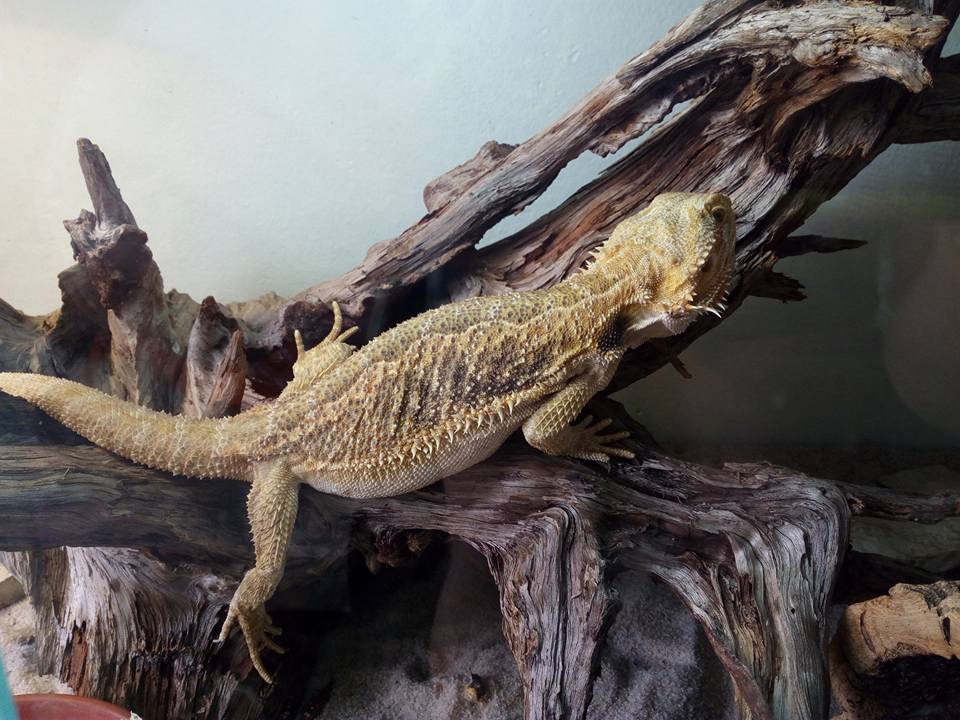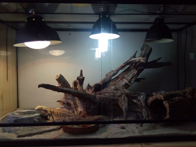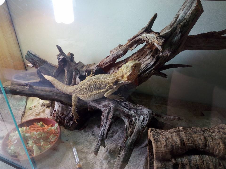 V úterý jsem dostal pogonu, lehce přes 1,5 roku starou, i s teráriem (100*45*45), samice. Pán jí přinesl že už jí nemůžou mít doma. Tak sem se jí ujal. V terárium jsou 3 lampy v jedné Arcadia D3 basking lamp 100w (po dní cca 40 - 42 °C) asi 20 cm od ní zoomed uvb 10.0 compact a ve třetí na druhé straně Sun glo 75w (tu jsem vyndal protože byla daleko od zdroje UVB a v tera by nebyl teplotní gradient).