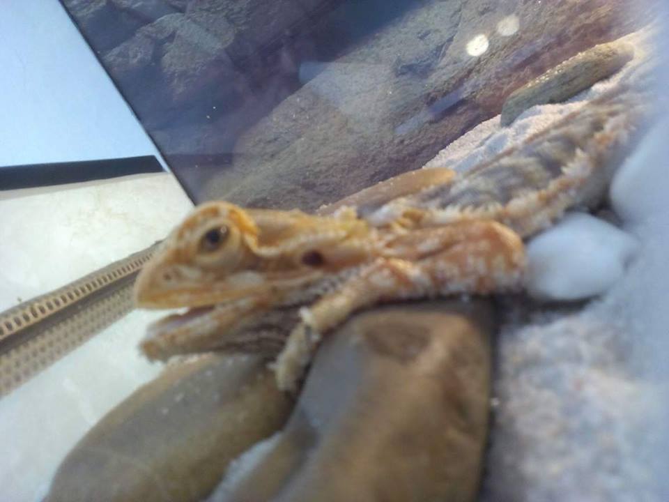Přiložené fotografie agamy těsně po vykonání potřeby. Normální barva trusu bývá tmavá, na fotce je vidět, že nyní tomu tak není. Dnes je opravdu velmi horký den a agama se chladí, dvířka otevřená a zkusila jsem vyměnit žárovku za obyčejnou co nehřeje. Aby měla světlo, ale již žádný jiný přísun tepla.