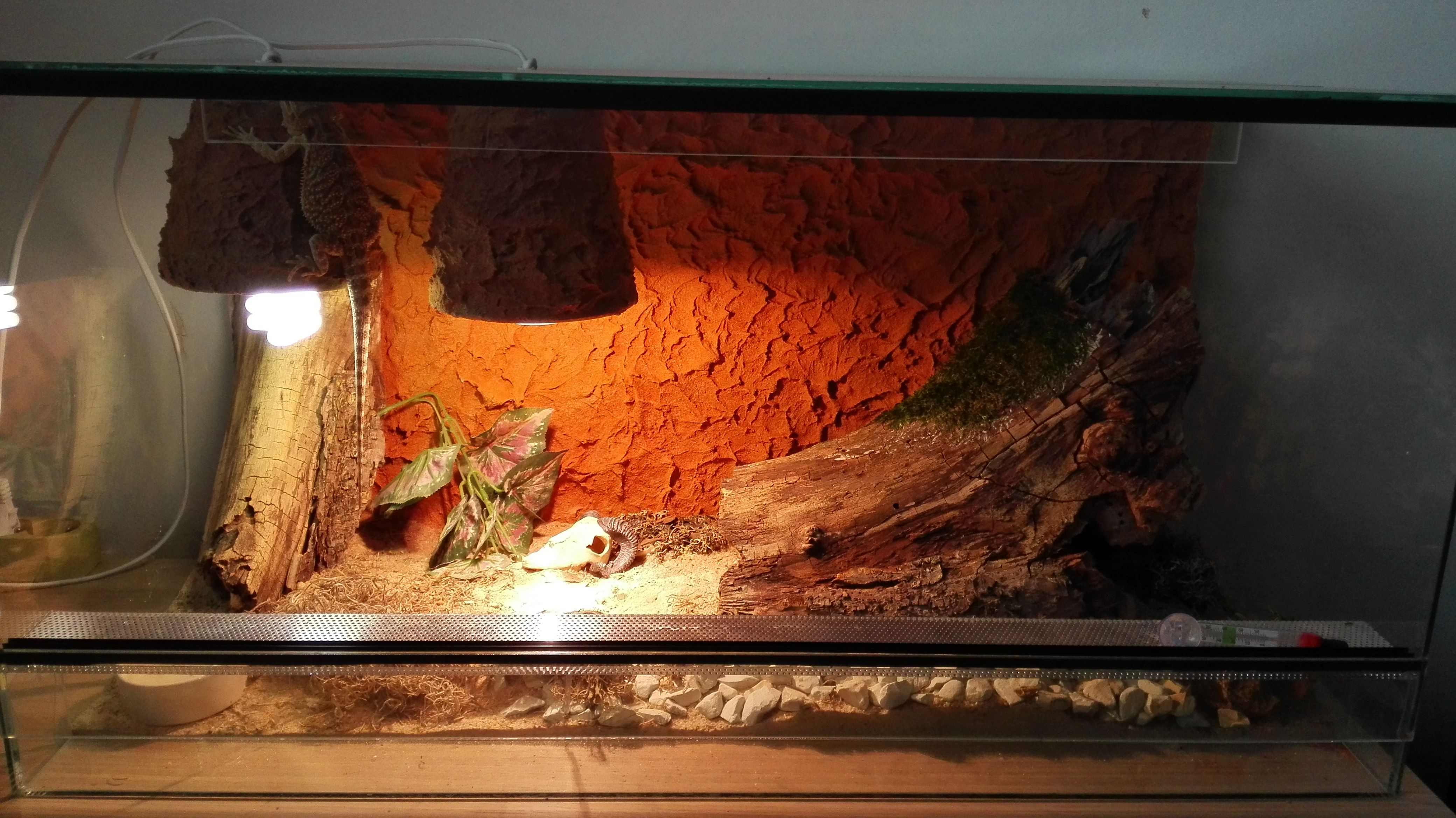 Ono je to terárko dost malé, takže by nebylo od věci zjednodušit vnitřní zařízení. Místo těch kusů dřev dát spíš nějakou větev s hrubou kůrou, která by se dotýkala dna jen minimem plochy a umožnila agamě šplhání. Výhledově bych ale přemýšlel o terárku alespoň 100x50x50 cm. V tom stávajícím určitě chybí plnospektrální zářivka, hlavně v tomhle období se její absence projevuje nejvíce na snížené aktivitě a žravosti. Nyní by Vám tam vlezla 60 cm: https://www.terasvet.cz/denni-svetlo-plnospektralni/narva-biovital-18w-t8-59-cm/