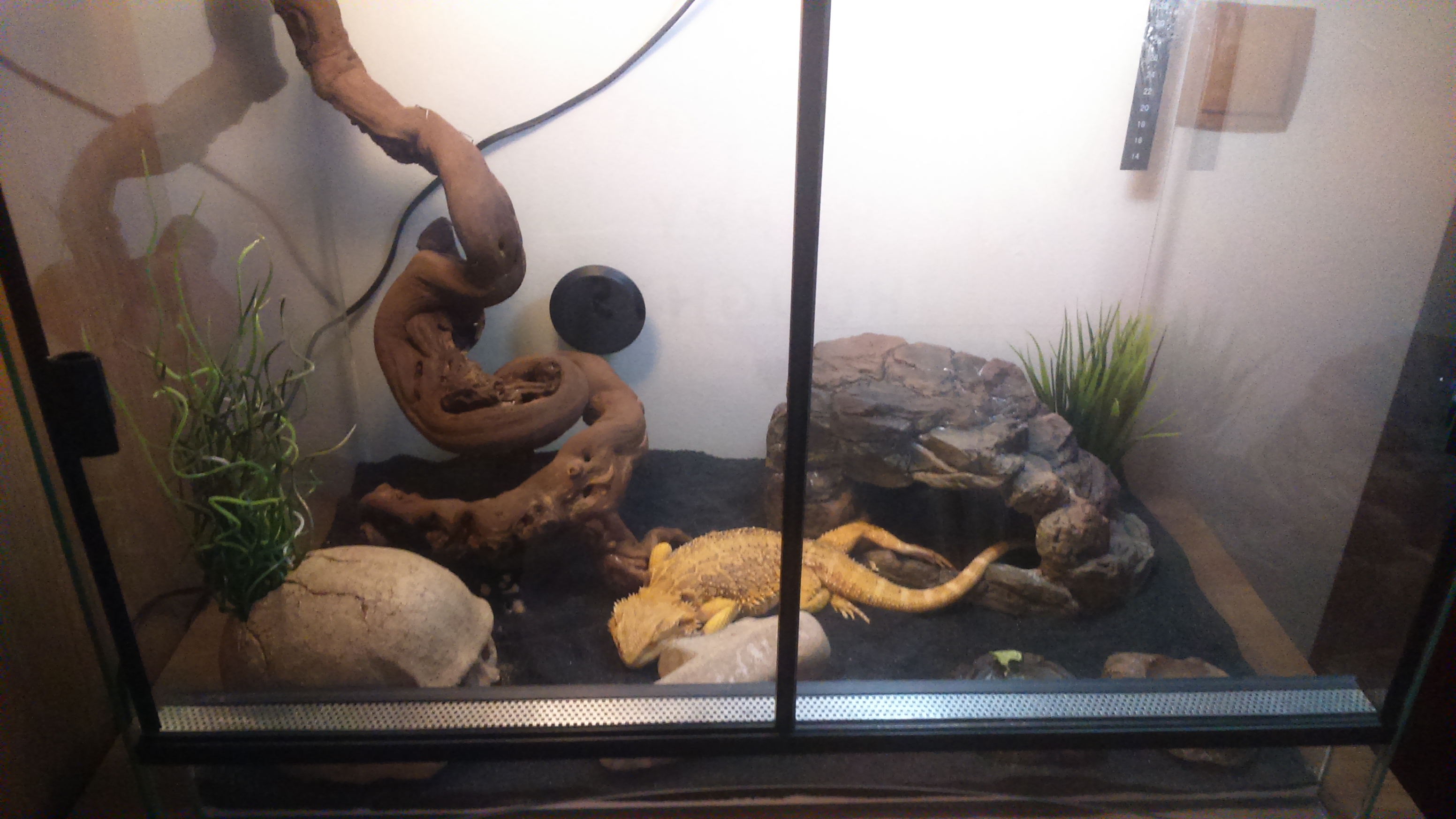 "ju nedavli von" je OK, agama patri do teraria - ne aby behala mimo nej. V prvnim rade - ty UVB Reptile jsou moc nahore, maji velmi maly ucinny dosah - tak 20cm maximalne, takze nechat je na kabelu spustene dole. A staci dle mne takhle dole klidne jedna,. a hned vedle ni povesit obycejnou bodovou-reflektorovou zarovkou - a pod ni kamen na vyhrivani. Vykon zarovky pokus/omyl aby bylo v prostoru kolem 30°C, a na tom kameni klidne 40-45. Kdyz na ten kamen polozite ruku, aby to hralo, ale nepalilo. Aby jste tam tu ruku proste udrzeli. Vyhodil bych tu lebku vlevo a ten kus cehosi vepredu uprostred, a misto toho ten vetsi plochy kamen. (uprimne i tu jeskyn vpravo bych dal asi ven). Pak jeste prosvetlit trochu vic prostor - pridat cim silnejsi zarivku - "trubici". Co tam mate za substrat? Nejak se mi nezda jako vhodny.