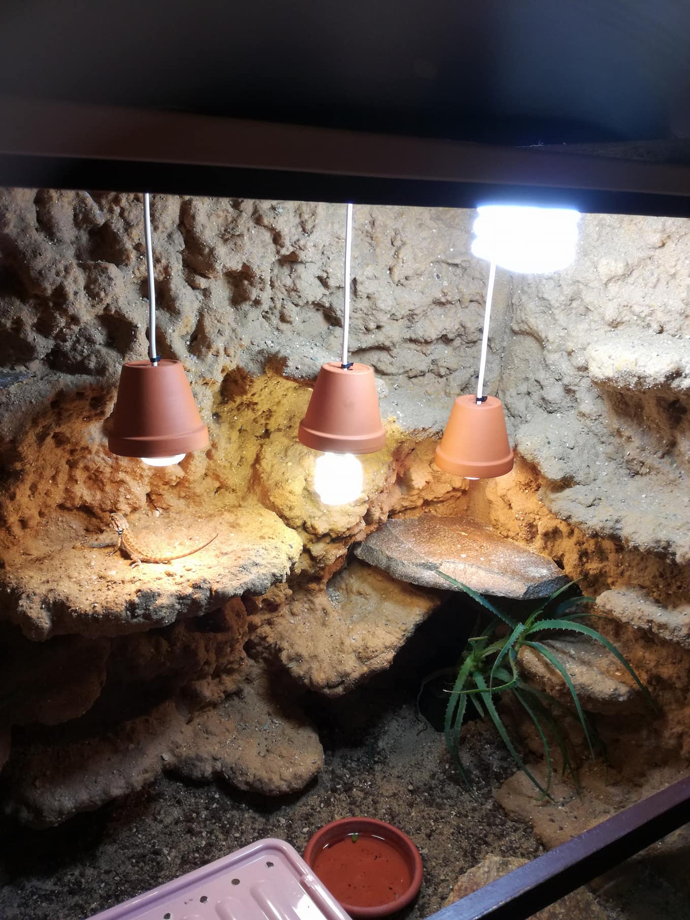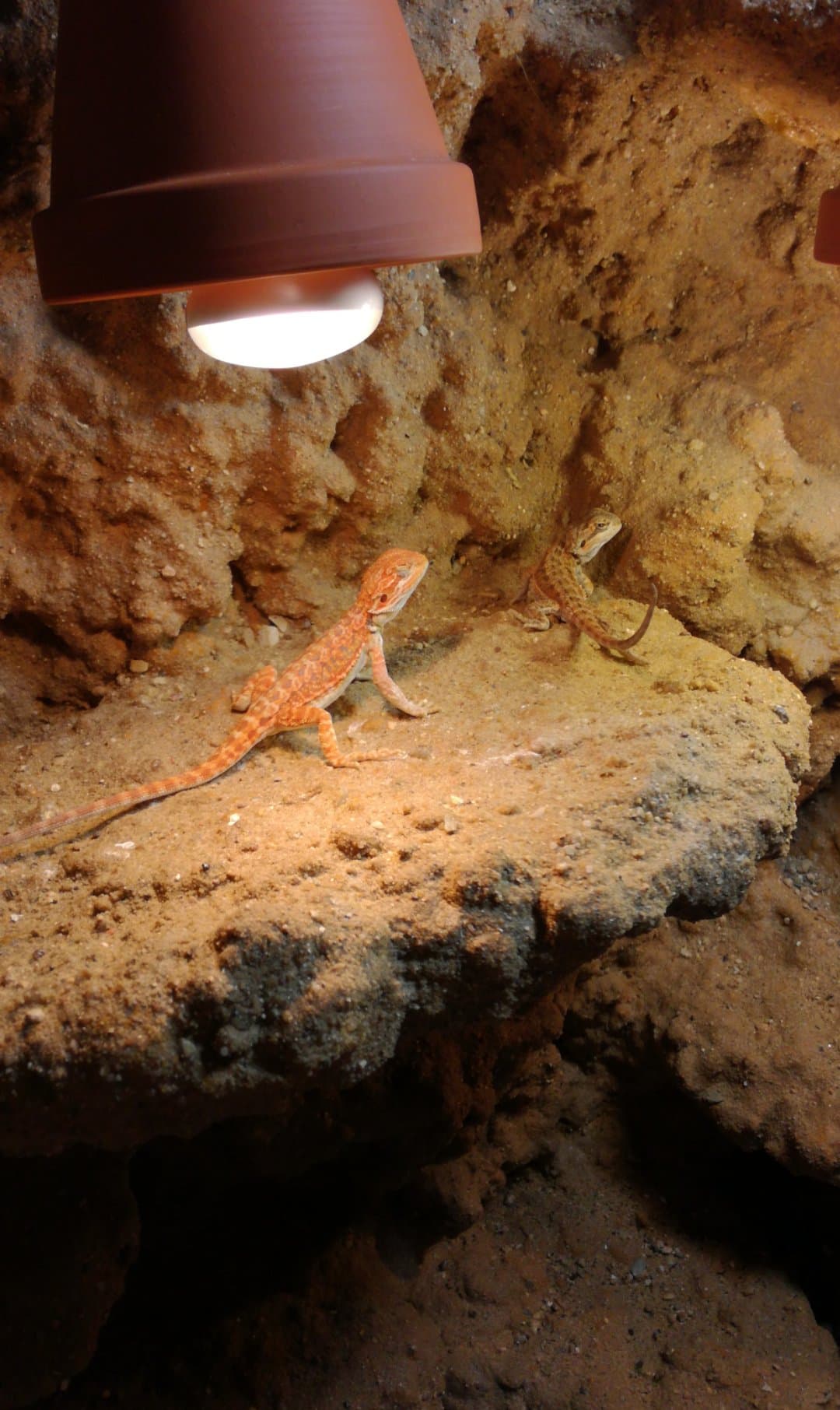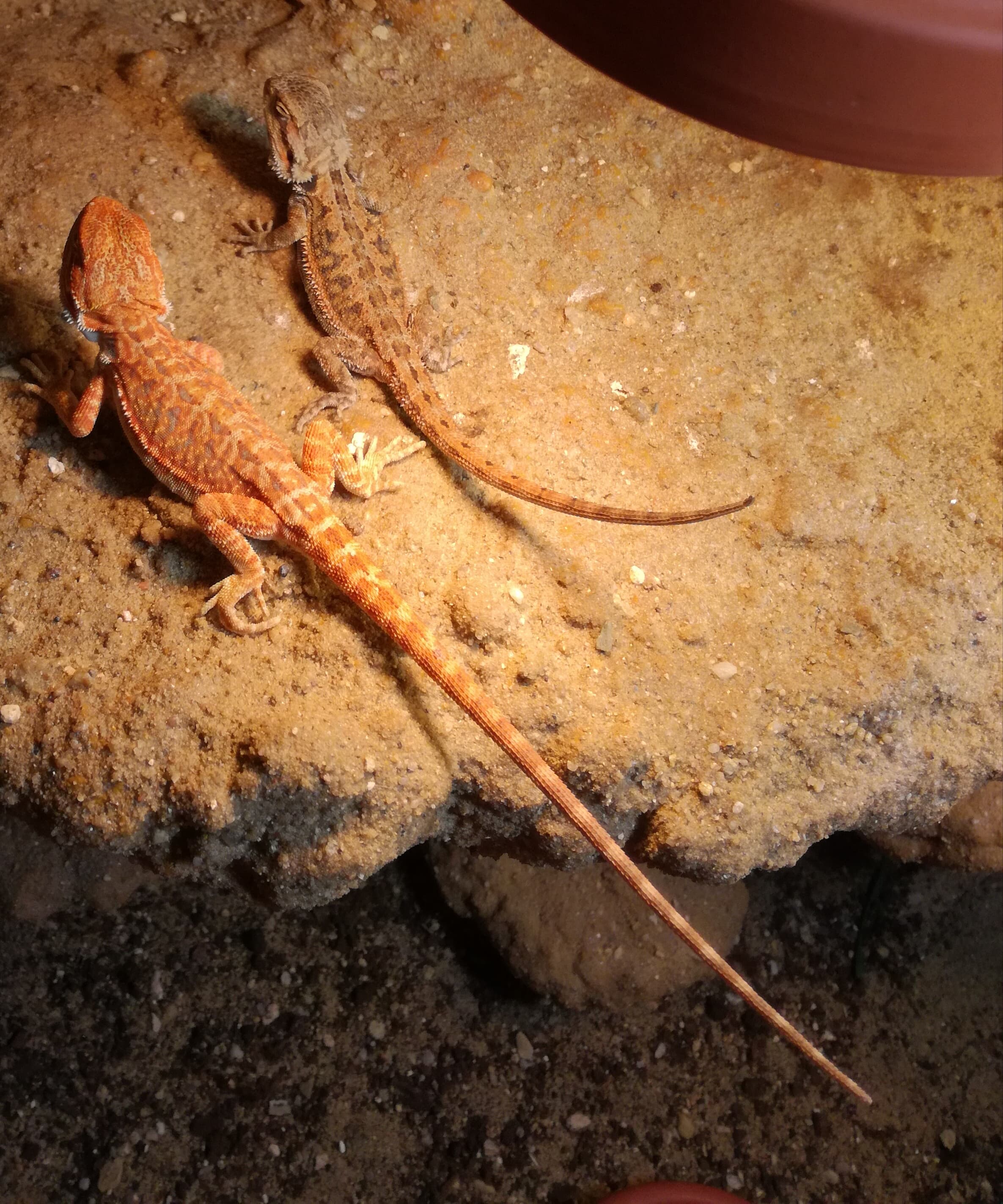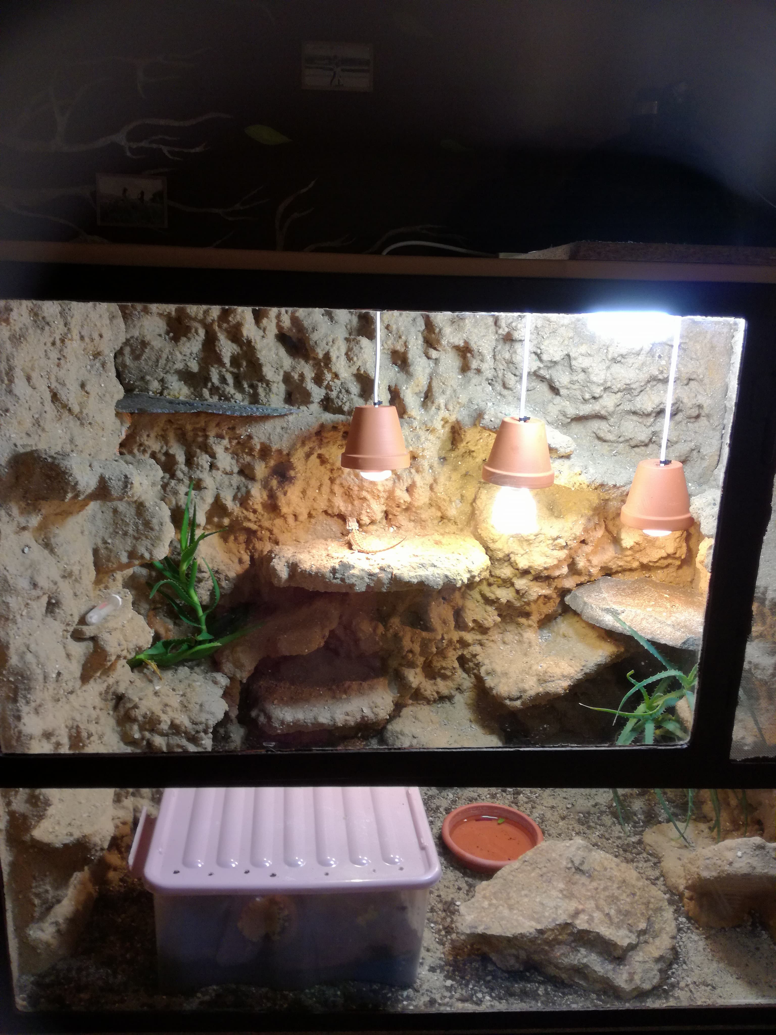 Jedna 2 měsíce (20cm) a druha malinko prez měsíc a pul (17cm) topim 2 žárovkami 40W, UVB reptile 150. Jinak točená trubicovita zářivka 140w na denni svícení. Rozměry terária 110x70x88