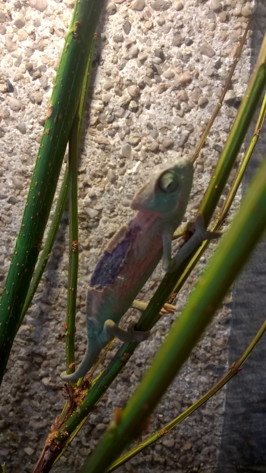 Dobrý den,máme cca 14 dnů doma chameleona jemenského, mládě staré cca 15 týdnů. Zhruba před třemi dny jsme si všimly tmavších fleků na stranách a předevčírem černých obou stran. Do včerejšího dne byl v menším terárku cca 40x50x40cm, čekali jsme na větší - nyní je přemístěn v terárku 50x40x80cm. Myslíme si, že se spálil o žárovku v menším terárku, kterou tam měl na dosah. Nemáte někdo zkušenost jak postupovat? Máme navštívit veterináře? Zdá se mi, že není - dáváme mu pít pinetkou a dnes jsme mu vložili 4 červi pinzetkkou. Zdá se mi, že jazyk nepoužívá. Děkuji moc za jakoukoli informaci.