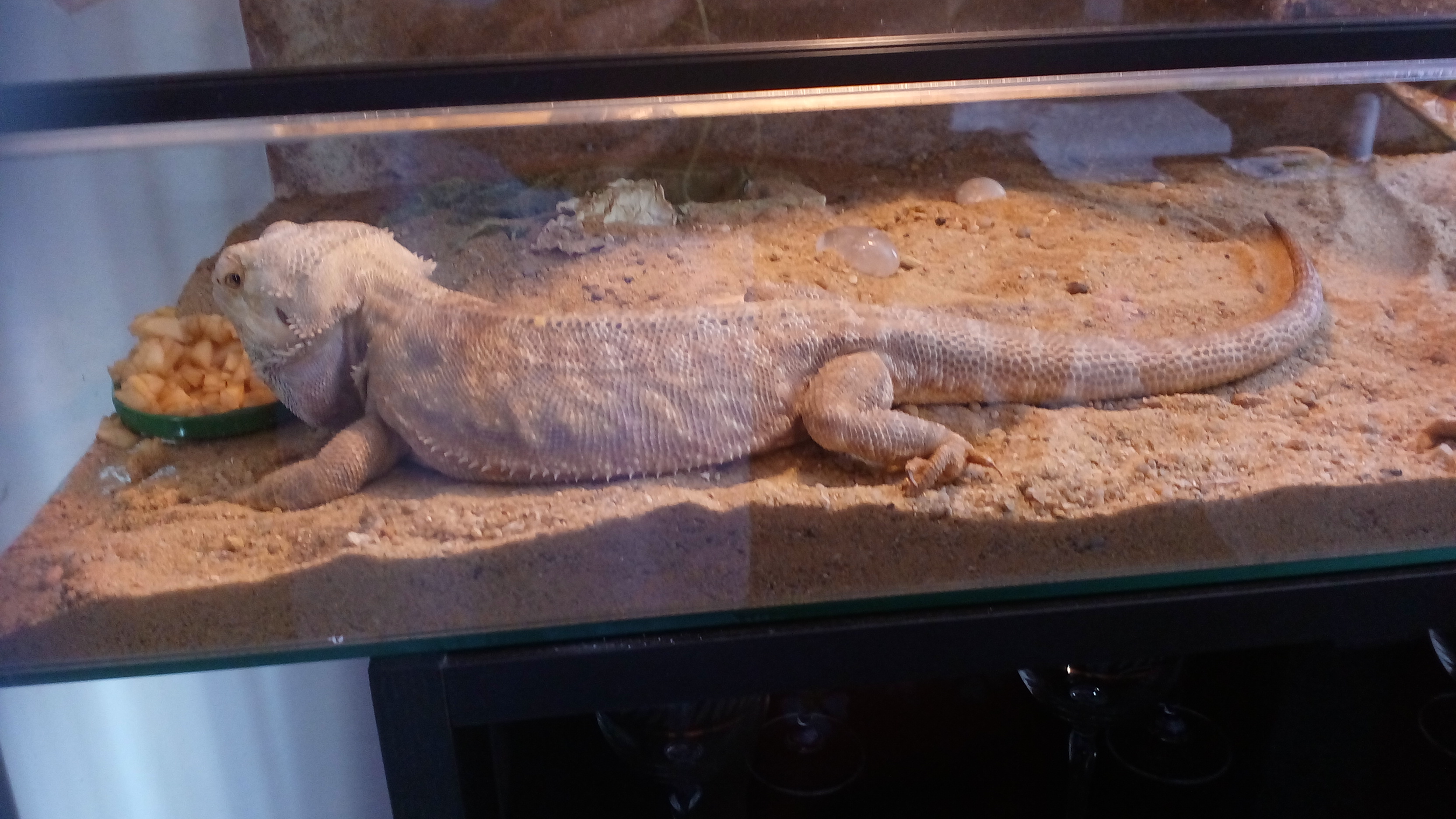 Má agama vousatá ( samec, 3 roky ) obývá terárko s menší samičkou, váha samce 400gramů, délka něják 50cm, 60cm, právě teď si nejsem jistá. Ocas má delší než tělo, terárko je velké: