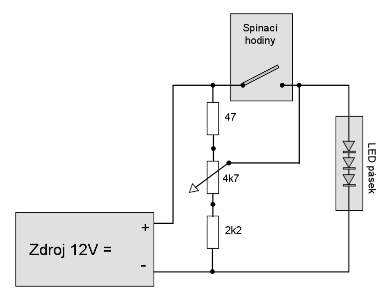 Teda aspoň ten první odstavec....pak už netuším o čem je řeč :-) "nemusite tam davat dalsi pasek, osobne to resim tak ze rozeberu spinacky a ven si vytahnu jen samotny spinany kontakt. Tim prerusim privod 12V k pasku - a tece do nej jen zlomek proudu pres odporovy trimr (kolem 5-10 kiloohmu) kterym nastavim pozadovanou intenzit"