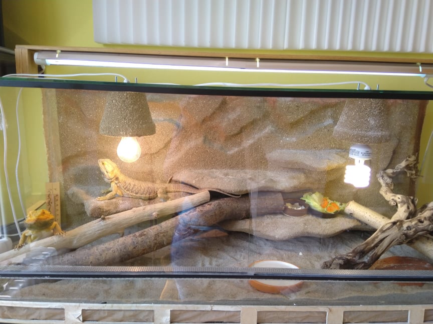 Zacnu od teraria - relativne OK, jen bych dal ten UV kompakt tam kde je i vyhrevna zarovka - proste at je na miste ktere maji zvirata v oblibe, at jsou k tomu dostatecne dlouho dostatecne blizko. Berte v potaz ze u techle UV-B usporek je dostatek UV dejme tomu do 20-25cm (v pripade Reptile UVB 200 25W). Na vyhrev je lepsi reflektorova zarovka - "bodovka", ktera pod sebou vytvori vyhrevne misto ktere by melo mit kolem 40°C - v zbytku teraria pak gradient dejme tomu 25 - 35°C. Jak je to v tomhle pripade netusim, chtelo by promerit. Jinak ale terarium myslim v pohode. Misto tech celkem hladkych vetvi by chcelo spis neco s hrubsi kurou, aby se jim po tom dobre lezlo. Ubral bych ty dve svetlejsi (vpravo spodni, vlevo vrchni)