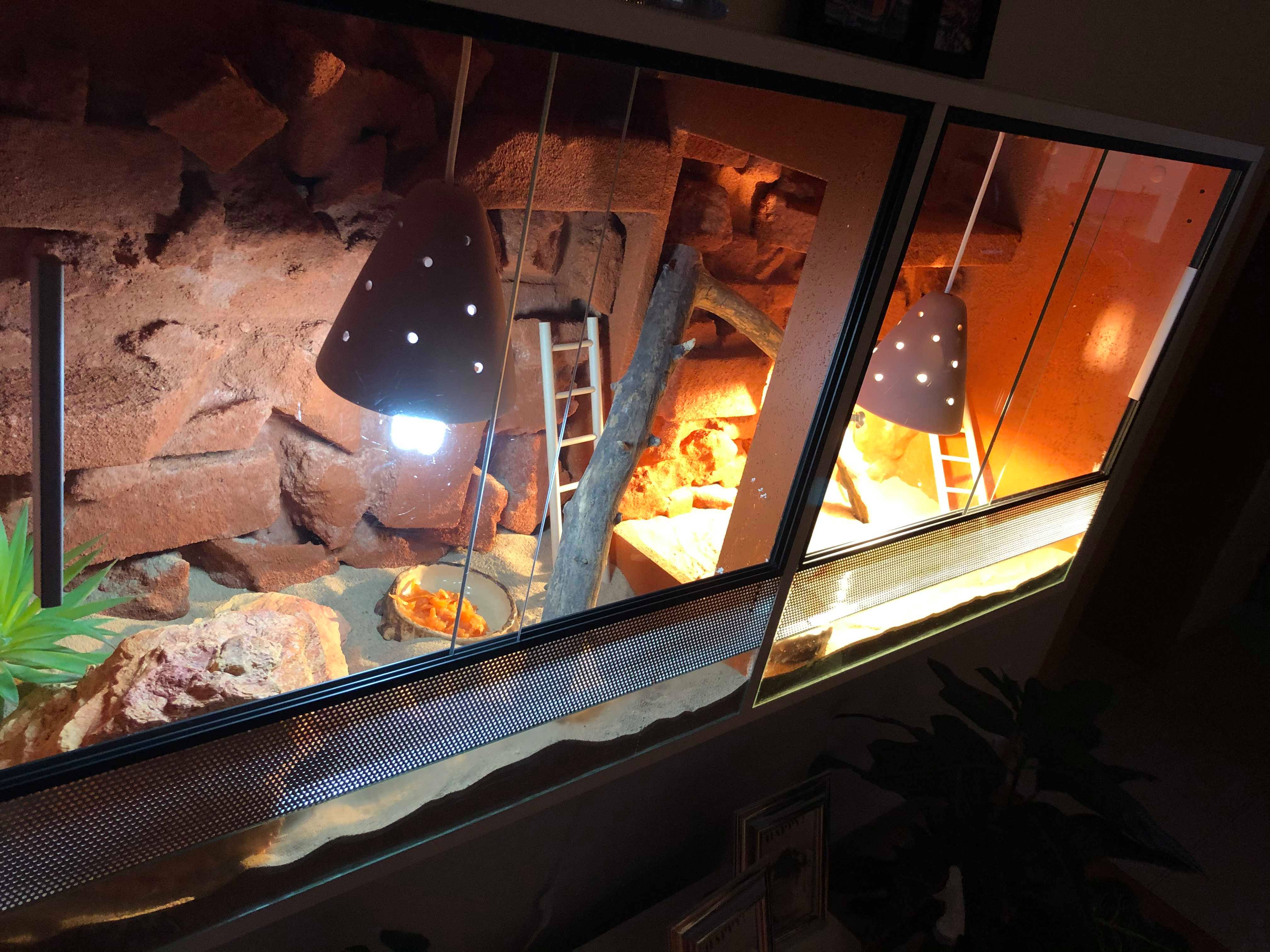 Teploty v teráriu v teplejší části okolo 30 stupňů a více, pod výhřevnou lampou až ke 40 stupňům. V chladnější části okolo 25-26 stupňů. Výhřevná lampa je 100W.