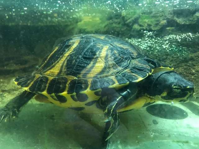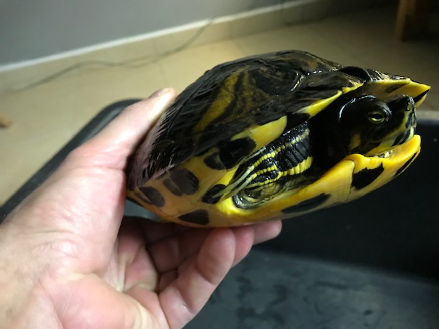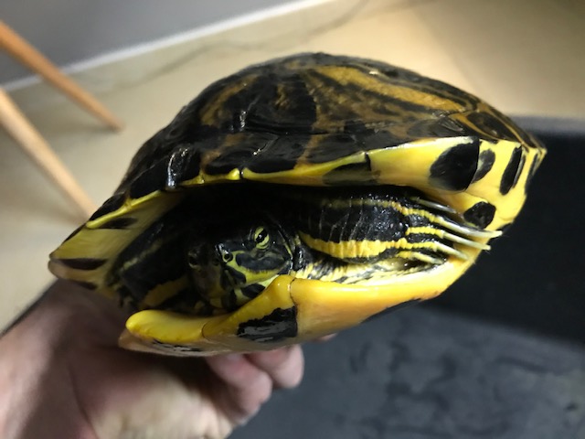 S vědomím majitele bych chtěl nabídnou k darování netradičně pestře zbarveného samečka želvy žlutolící (trachemys scripta scripta). Jde o nalezence, současný majitel se o želváka nemůže starat.