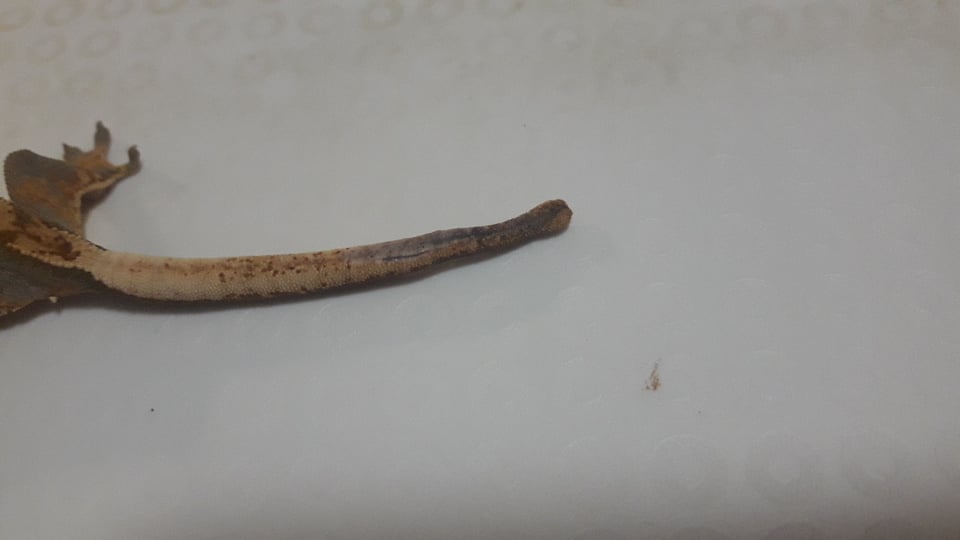 Fotka je ze dneška, skvrna je v poslední třetině ocásku, po boku je to takové rozšklebené, tam se právě ona skvrna začala odlupovat a pod ní je ta podle mě živá tkáň.
