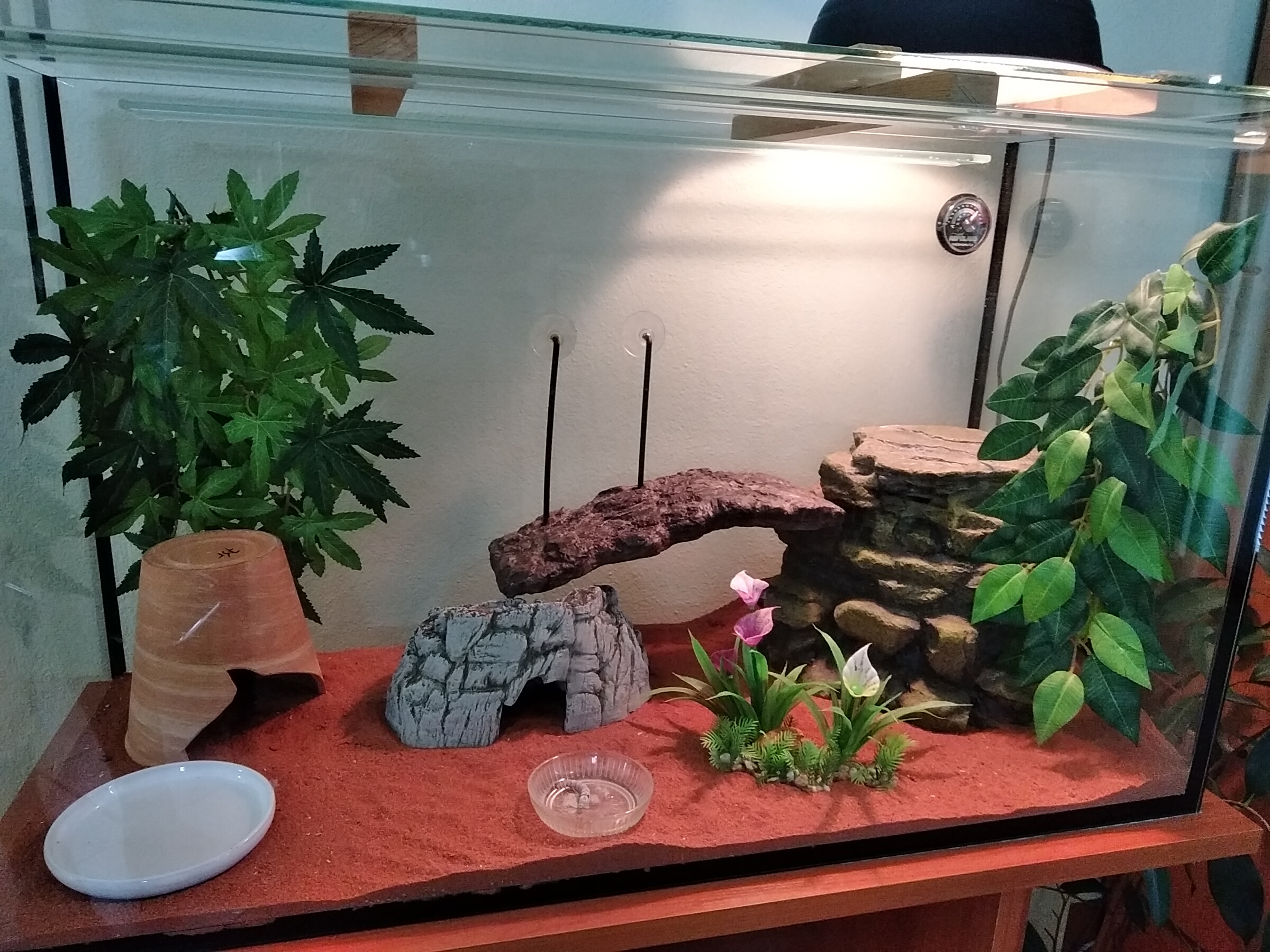 Moc děkuji za odpověď, jako tepelný zdroj máme lampu umístěnou nahoře terária. Ze začátku se chodil alespoň koupat do misky s vodou, teď pár dní ne, dneska v noci ani že skrýše nevylezl (dle stop v písku). Má tam skrýš z květináče a druhou takovou skálu - tam je prakticky zalezlý pořád, potom větší skálu, která není dutá,ale vhodná k lezení a nahoře místo k výhřevu.