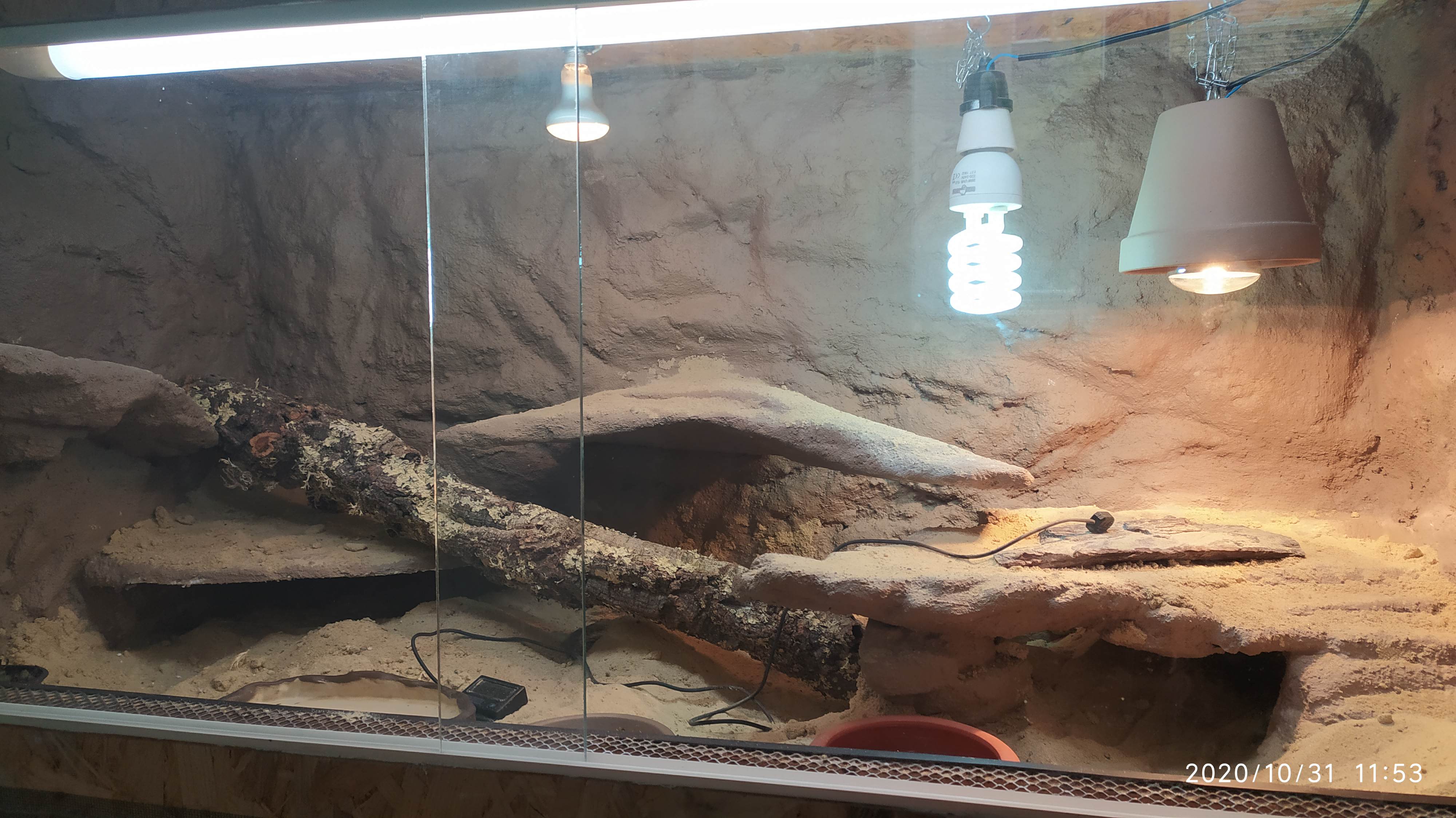 Teploty: výhřevné místo- cca 40-45 C, nejchladnější (jeskyňka)- 24 C, zbytek terária kolem 29 C (dle vzdálenosti od výhřevu samozřejmě). Teploty měřím teploměrem s čidlem.