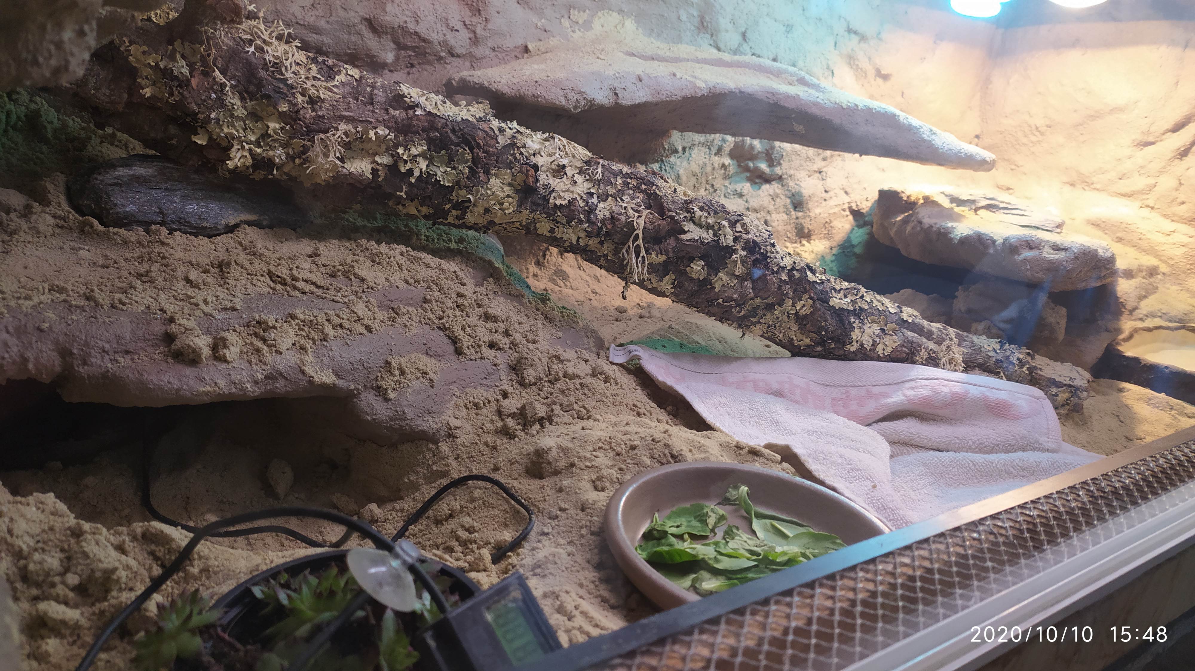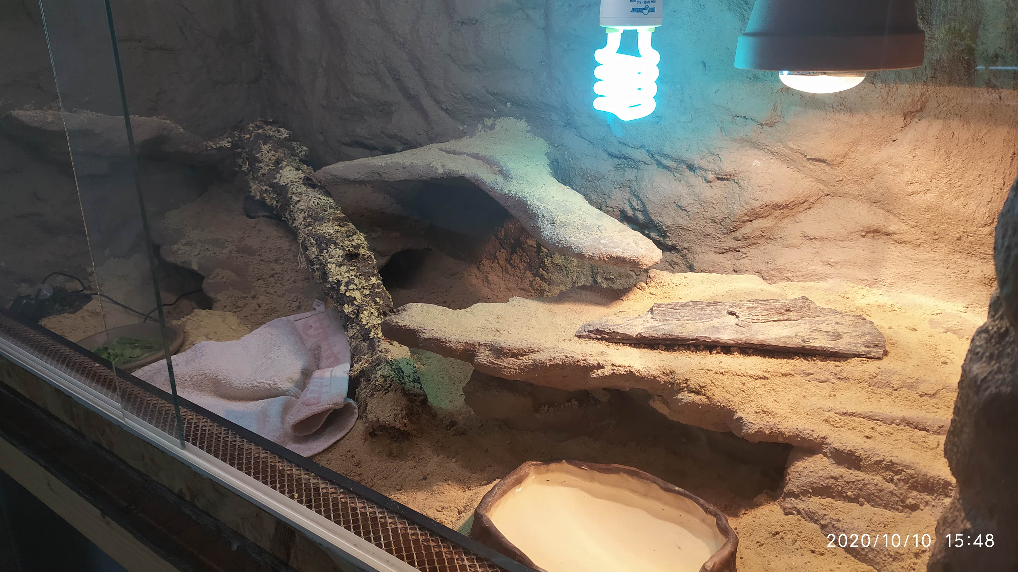 Ad. V terariu je o něco víc světla než na fotce vypadá a agamka je ukrytá pod ručníkem, který je tam od včerejška. Začala se podhrabavat pod misku s vodou a líbilo se jí tam, ale báli jsme se že by to na ní mohlo spadnout, tak jsme misku přesunuli a nahradili to malým ručníkem.