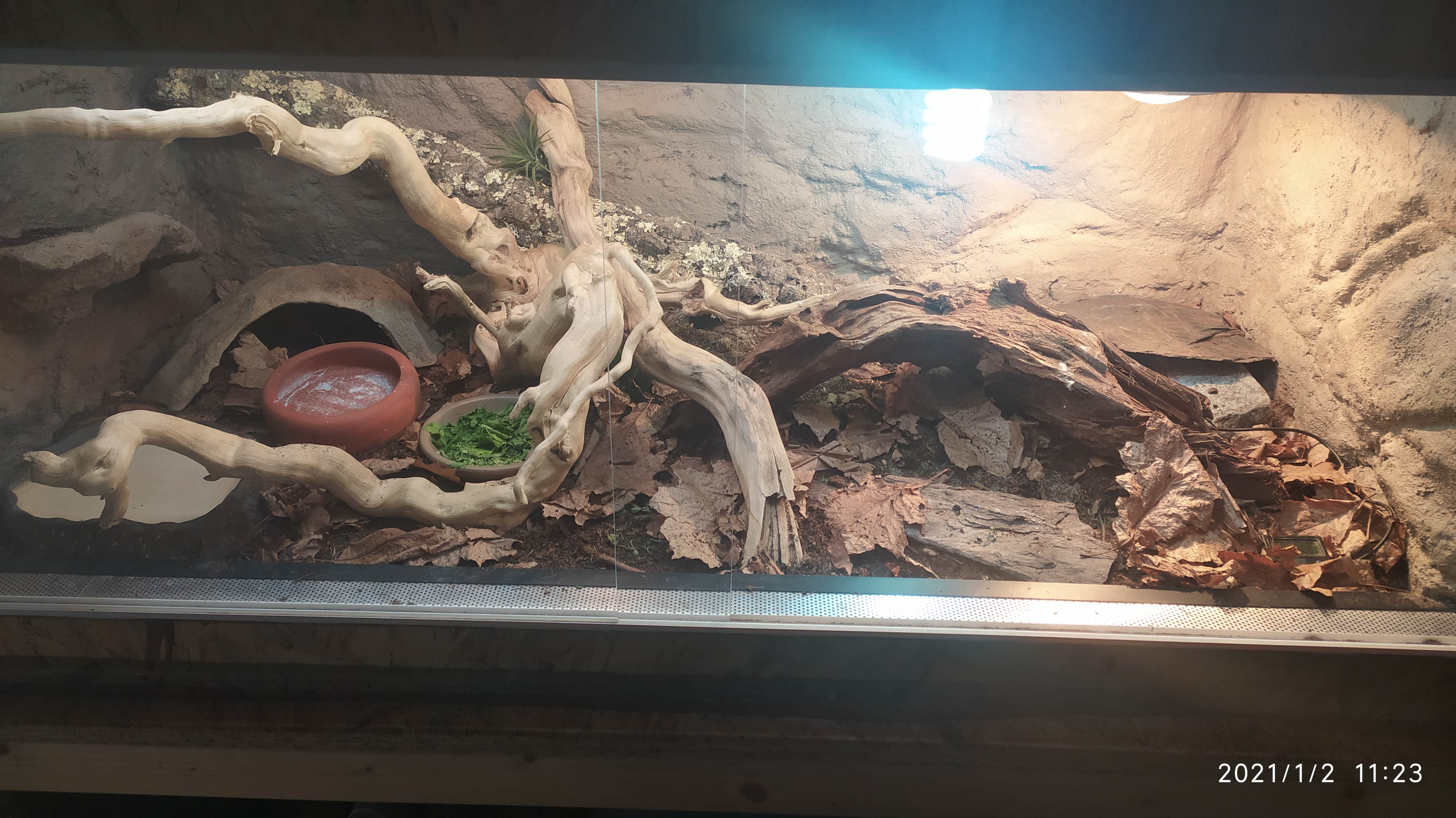 Teploty: výhřevné místo- cca 40-45 C, nejchladnější (jeskyňka)- 24 C, zbytek terária kolem 29 C (dle vzdálenosti od výhřevu samozřejmě). Teploty měřím teploměrem s čidlem.