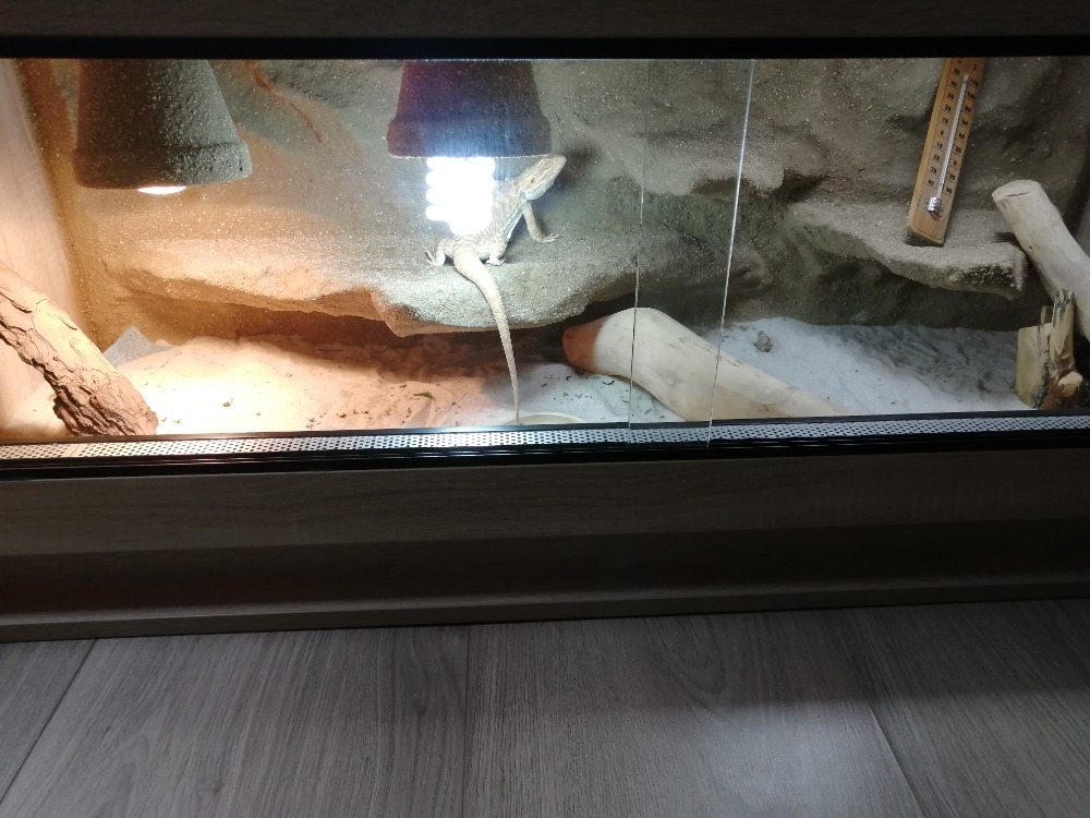 Teploty: Na výhřevné místě 40-45°C, na nejchladnějším 24-26°C, zbytek terárka má asi 28-30°C.