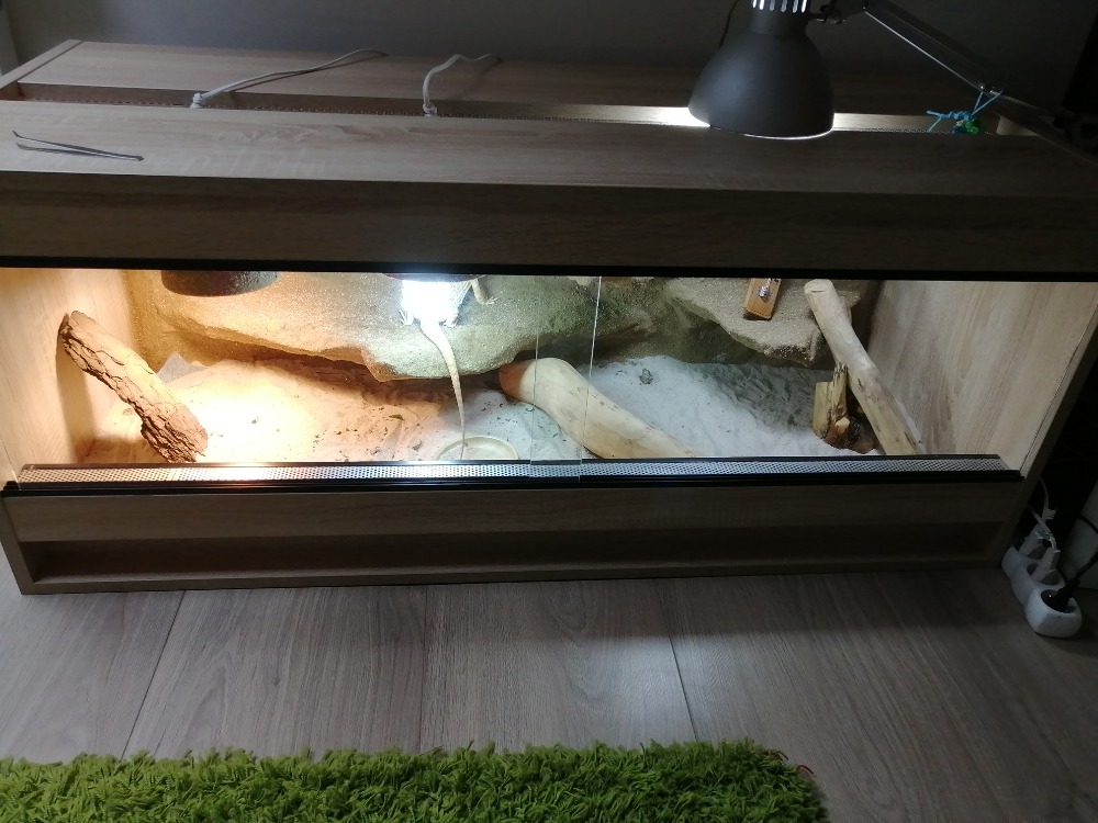 Terárko má rozměry 120x50x50, ubstrát je terarijní písek.
