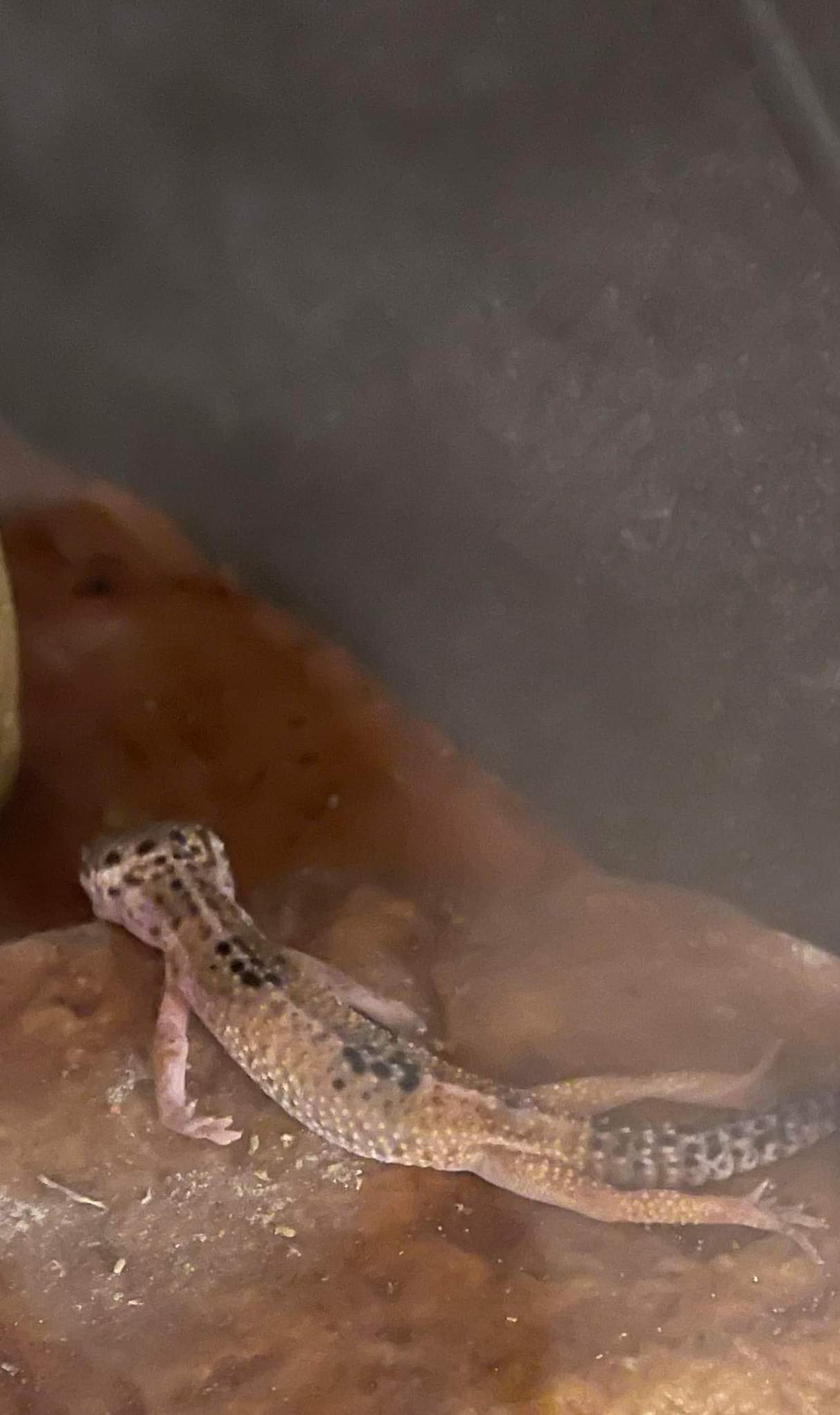 Uprimne, to zvire vypada hrozne spatne, a troufnu si rict ze ho vlmi pravdepodobne uz nejde zachranit. Pokud jste neudelali nejakou zasadni chybu co se podminet tyce, tak za to nemuzete - nebylo v poradku uz pri koupi. Ty podminky jsou u gekonciku velmi jednoduche, teplota kolem 28°C (s nejakym gradientem), dostupna miska s vodou, ukryt, krmeni. A pokud mozno tak zadny substrat, nebo jen trochu pisku.