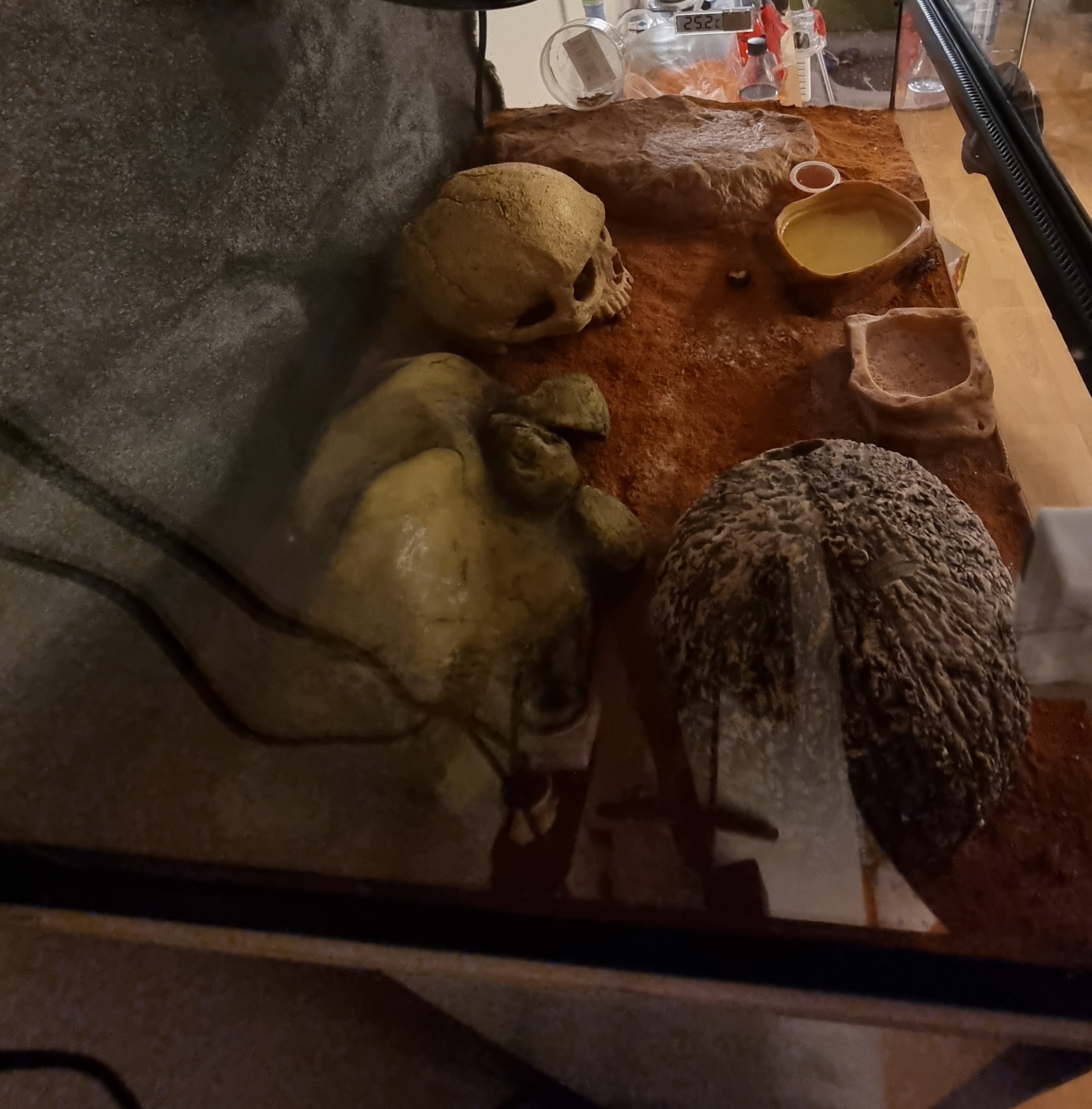 Prave sme zistili,ze aj oko bud nema alebo nepouziva uplne sme z toho na nervy..prikladam fotku teraria..a aj fotku so surodencami..aj ked si myslim,ze to bol nejaky tipek co nema sajnu..ale co uz..ma tam vädsinou 26 stupnou a ma vyhrevny kamen v noci a cez den lampu.vodu menime kazdy den.tak isto tam ma aj vapenec. A nic nechce..ma tam piesok ktory bol ale poliaty cize stvrdol