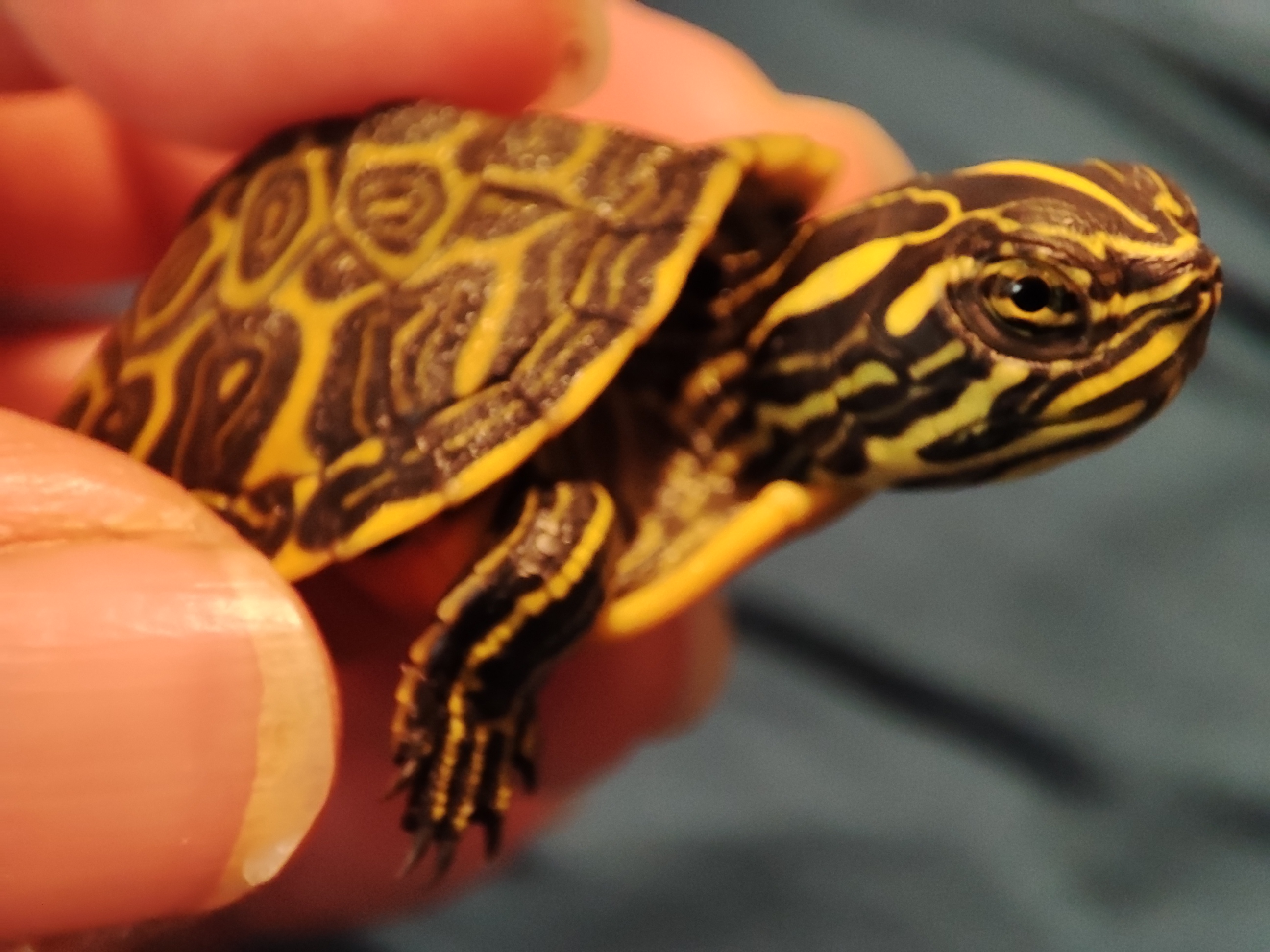 Že je to od pupečníku vím, ale nebyla jsem si jistá jestli jim tam dírka zůstává nějakou dobu, nebo je hned po vylíhnutí uzavřená. Vodu má 25° vyhřívanou klasicky topítkem, pod žárovkou se vyhřívá většinu dne. Je tedy extrémně žravá, jak něco dopadne do vody, tak se po tom hned vrhá a žere jak nezavřená. Nejradši má kukly moučných červů. Ta želva ozdobná by to asi být mohla, ale nemůžu si za boha pořád vzpomenout. Zkusím ji během dne nafotit lépe. Ptala jsem se paní na burze, jestli je to želva žlutolící, při prvním zběžném pohledu mi tak přišla v krabičce, ale říkala mi právě že ne, že je v nich rozdíl, že tahle má oranžový spodek krunýře 🤔