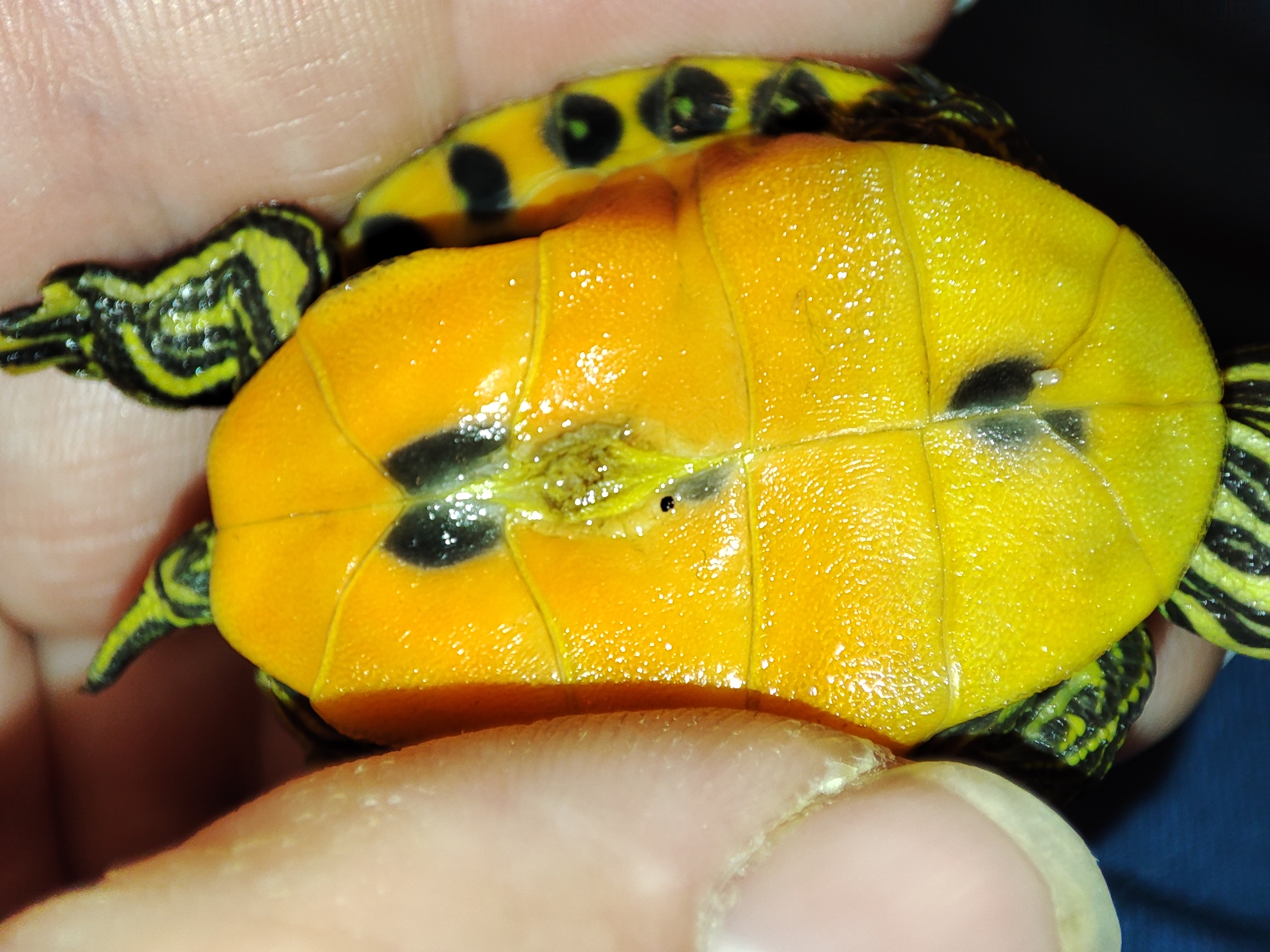 Dobrý den, ta měkká dírka jak uvádíte je pupeční otvor. Mládě je čerstvé. Chce to dobře krmit především porcovanými rybkami (včetně kostí, čili žádné náhražky jako maso), vodní šneky (kvůli dotaci vápníkem), žížaly (teď má pršet, takže bude šance nasbírat). Dle mého názoru se jedná o druh Pseudemys peninsularis (podobná je P. hieroglyphica, která má vpodstatě totožné podmínky chovu). Teplota pod žárovkou ve výšce krunýře 35-38C, teplota vody cca 24-25C. Chov je bezproblémový, správně živená zvířata mají po roce cca 6cm, další rok se velikost zdvojnásobí. Lepší bývá chov alespoň dvou kusů, ale to už je na každém chovateli.